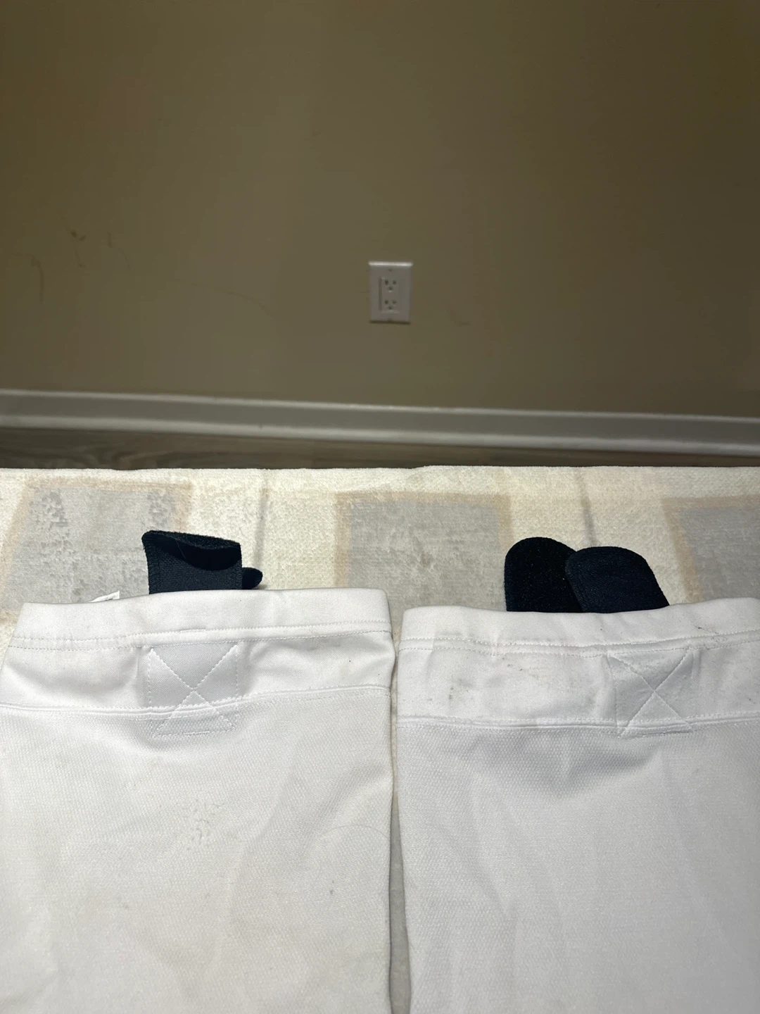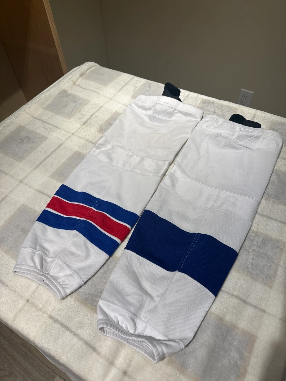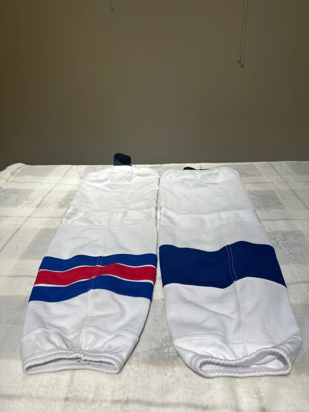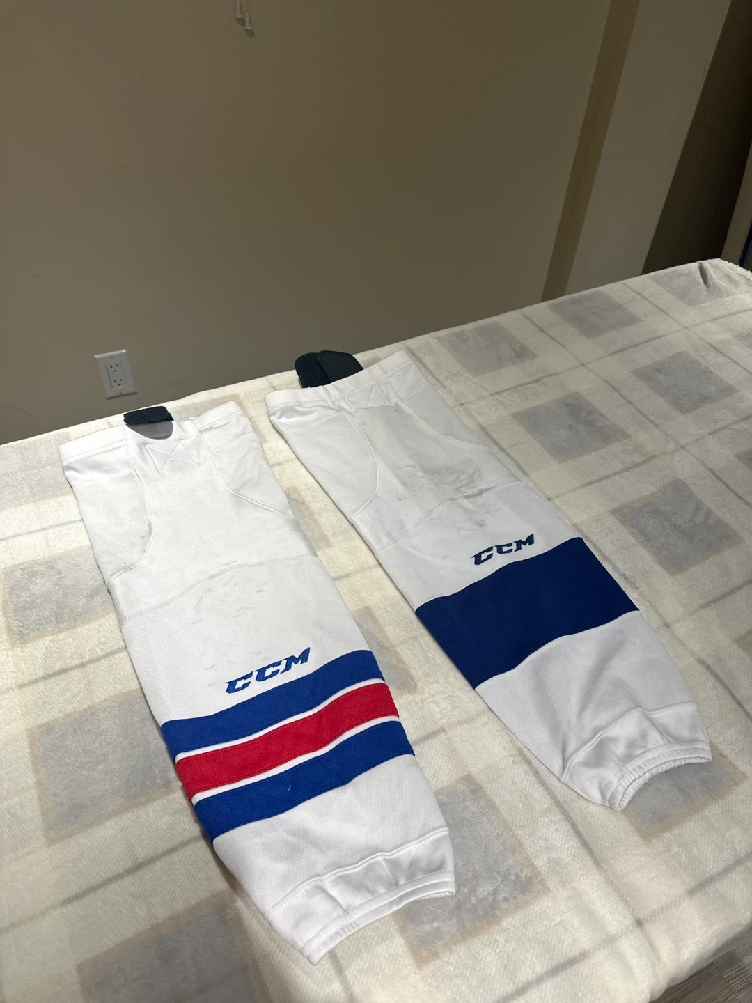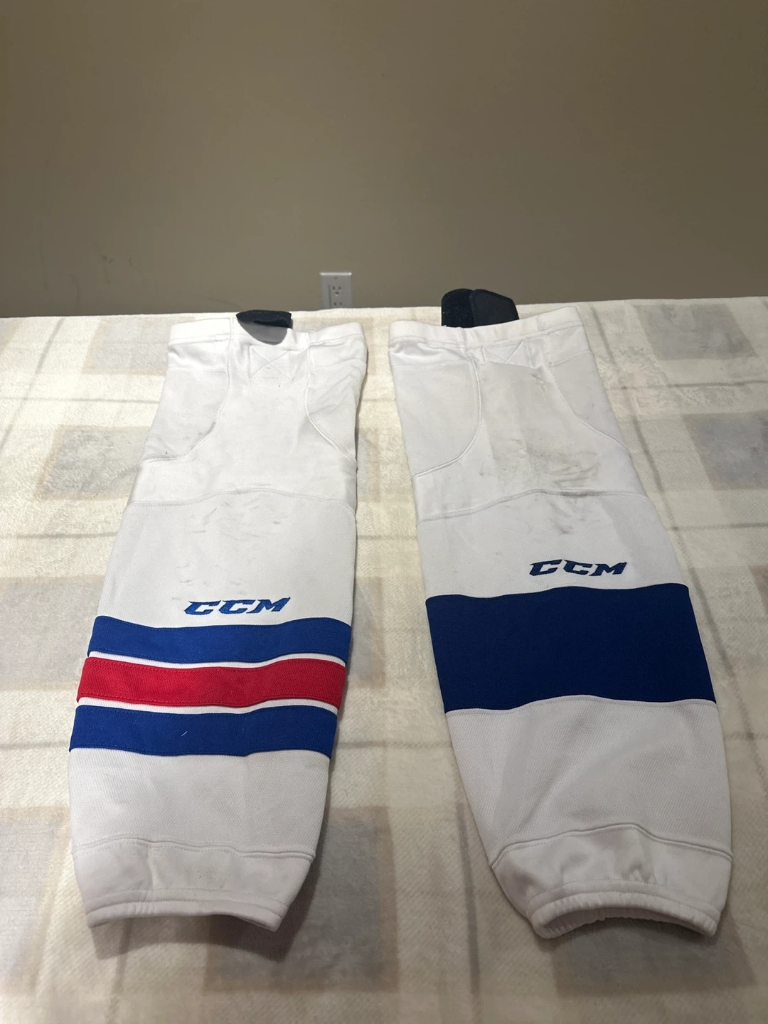 197Selling a pair of CCM hockey socks. One is white with a blue stripe, and the other is white with red and blue stripes. Great for hockey players!