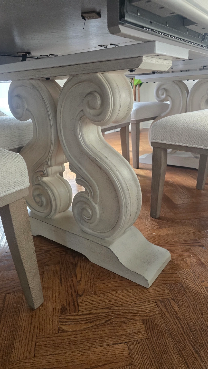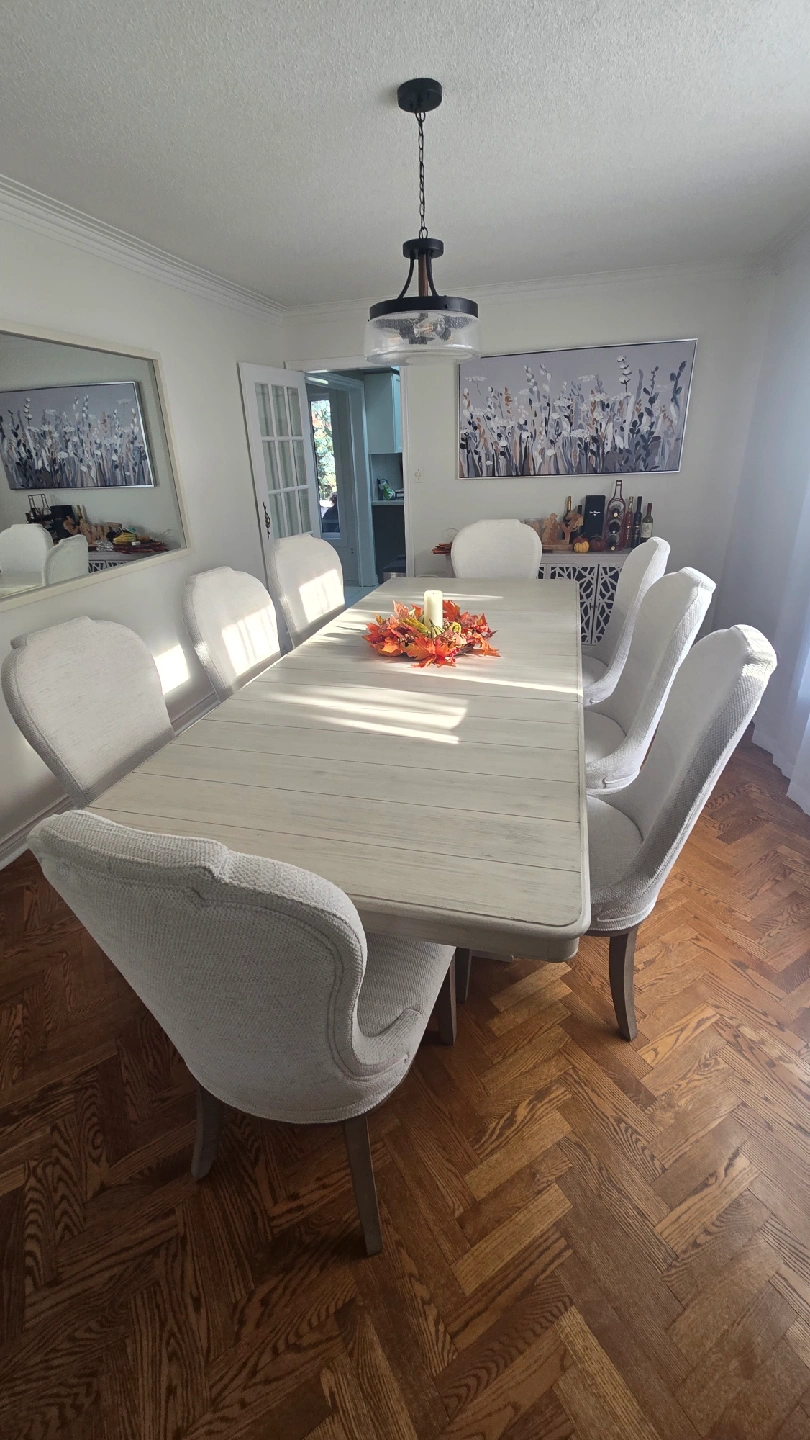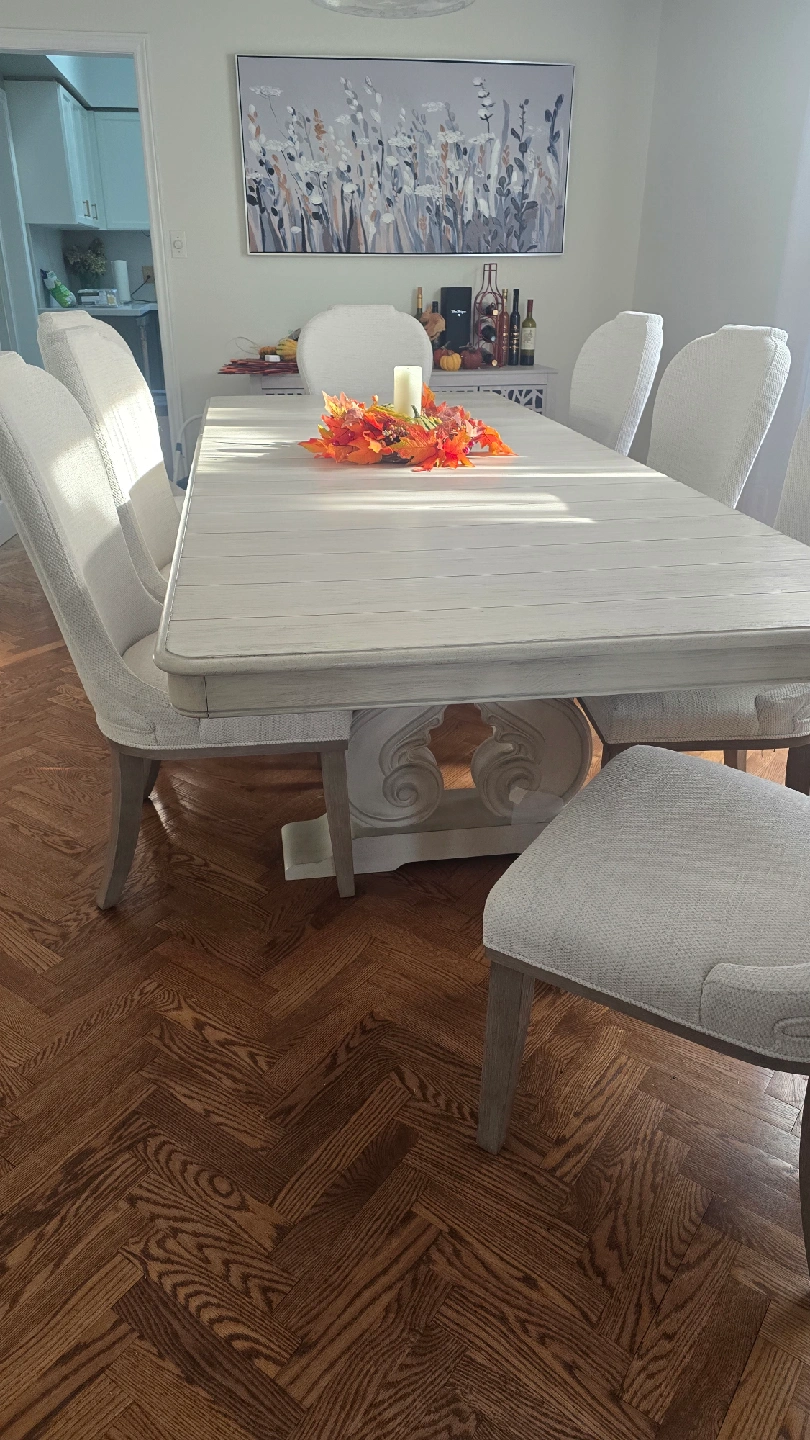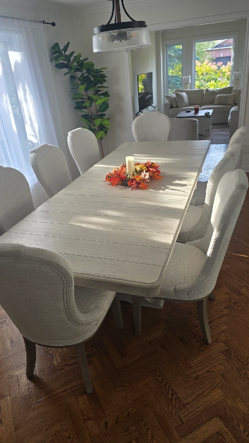 60Ashley Furniture Jorlaina Dining Table with 8 Chairs – Like New! Beautiful Ashley Jorlaina dining set, purchased new in February 2025 and barely used – only a handful of times. Includes 8 matching chairs and a solid wood table that extends from 6 ft to 9 ft with leaves in. This set combines a modern farmhouse look with excellent quality and craftsmanship. Perfect for family gatherings or entertaining guests. Condition: Excellent / like new Finish: Light wood tone (Jorlaina collection) Table dimensions: 6’ (without leaves) to 9’ (with both leaves) paid $4300.00 new