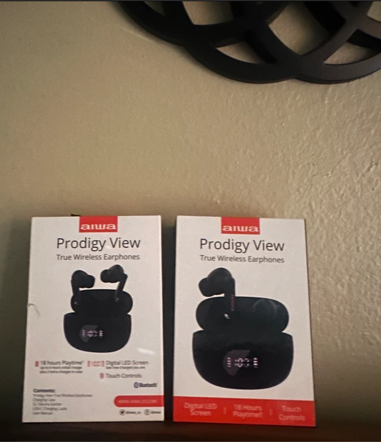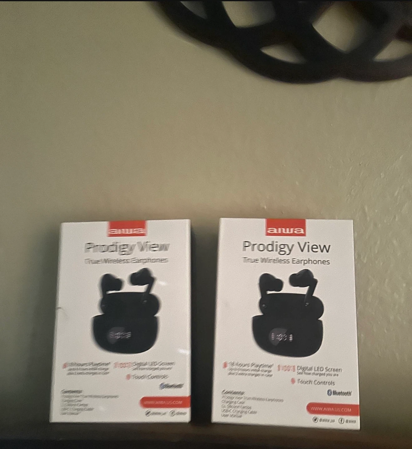 Selling two pairs of Aiwa Prodigy View True Wireless Earphones, both in excellent condition. They feature 18 hours of playtime and a digital LED screen. Also included are touch controls and Bluetooth connectivity. Each box contains the earphones, charging case, USB-C charging cable, and user manual.