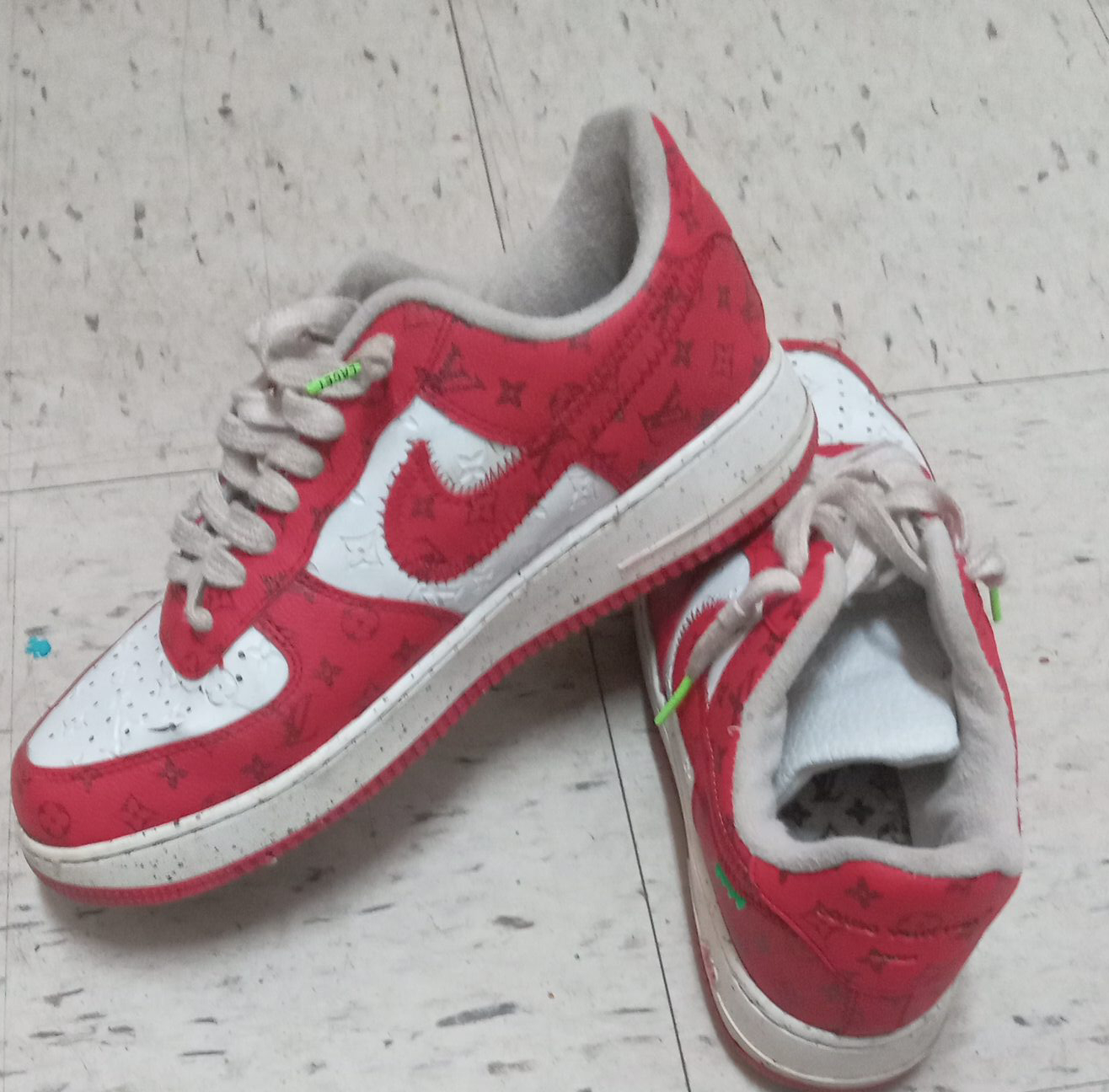 Selling a pair of Nike Air Force 1 sneakers with a custom red design. They're in good condition and ready for a new home!