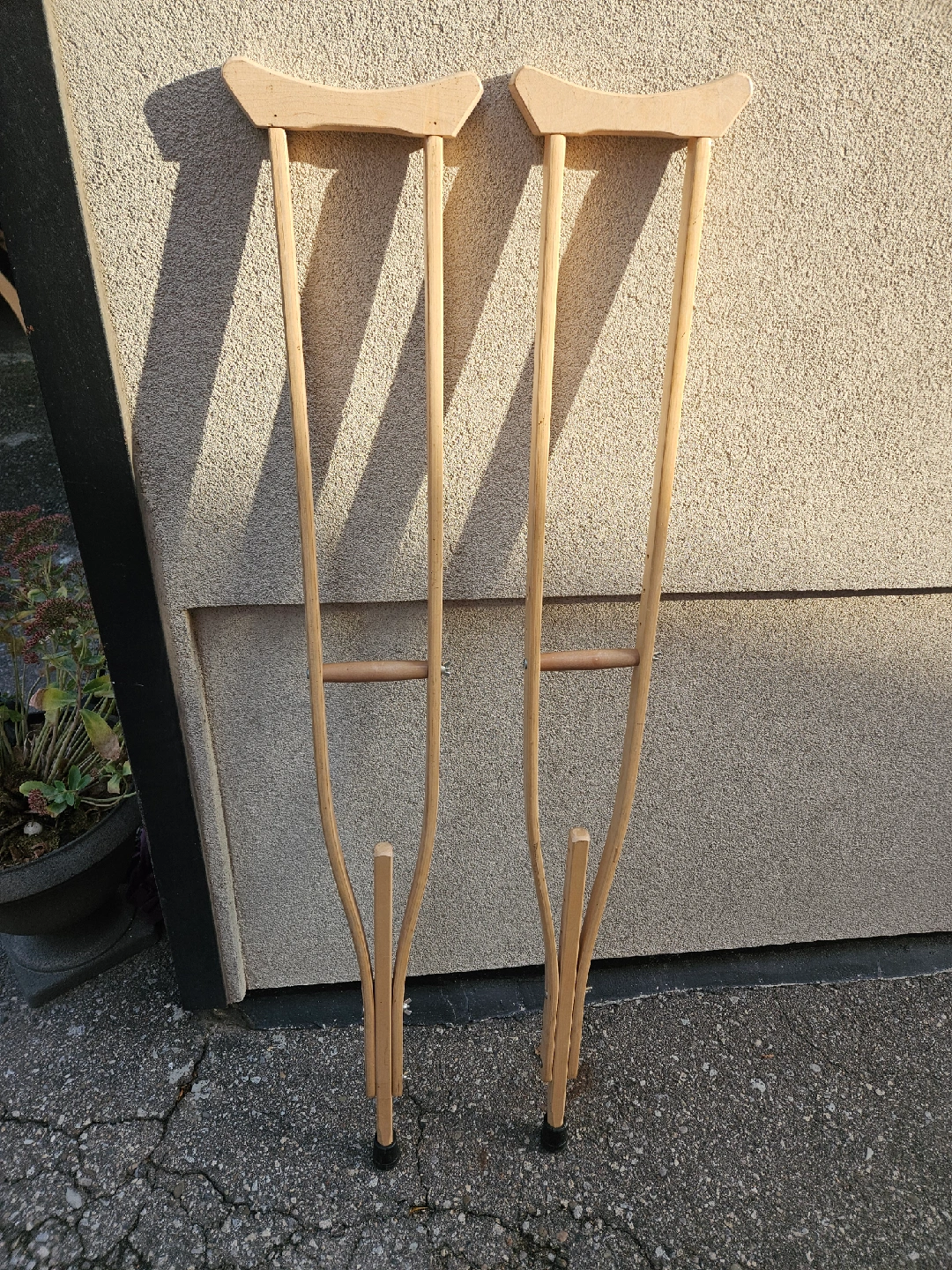 38Selling a pair of wooden crutches. They are adjustable to different heights, making them suitable for various users. They appear to be in good condition and ready to help someone in need!