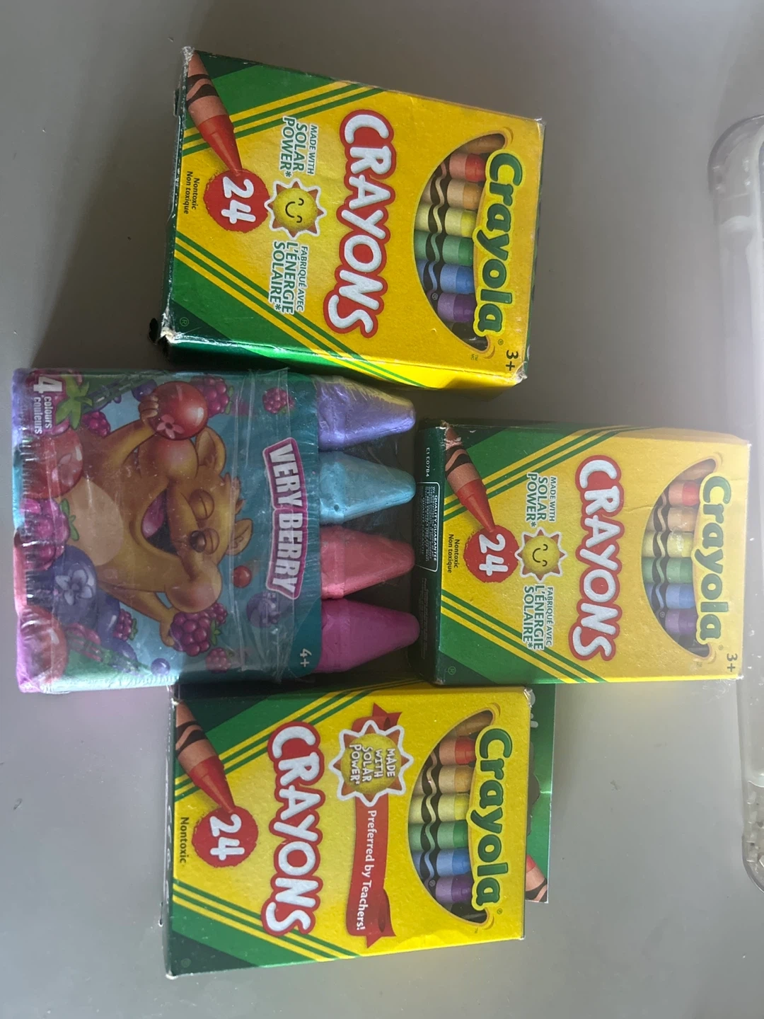 I have a few packs of Crayola crayons for sale! Two are the classic 24-pack crayons. One is a pack of 4 Very Berry crayons. Great for kids aged 3 and up!