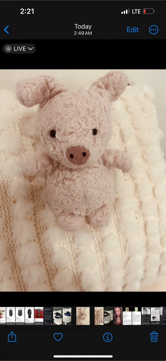 Selling a Jellycat Little Pig plush in a lovely pink colour. It's in like-new condition and super soft! The size is about 7-8 inches. Such a cute stuffed animal! Selling at low price to brighten someone’s child’s day. It retails 40 to 60 and up as this one is no longer made . No stains or marks . From smoke free home .just got it professionally cleaned . So like new.selling for only 10 has even tag still on . (Also have a listing for free item for kids for Halloween 🎃 )