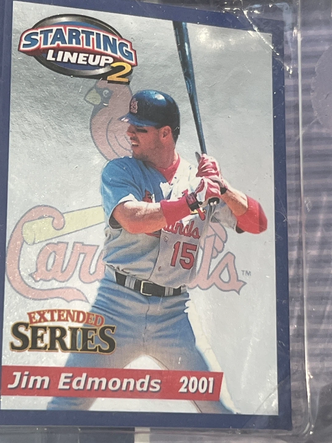 Selling a Starting Lineup 2 action figure of Jim Edmonds from 2001! This Extended Series figure of the St. Louis Cardinals player is still in its original packaging.