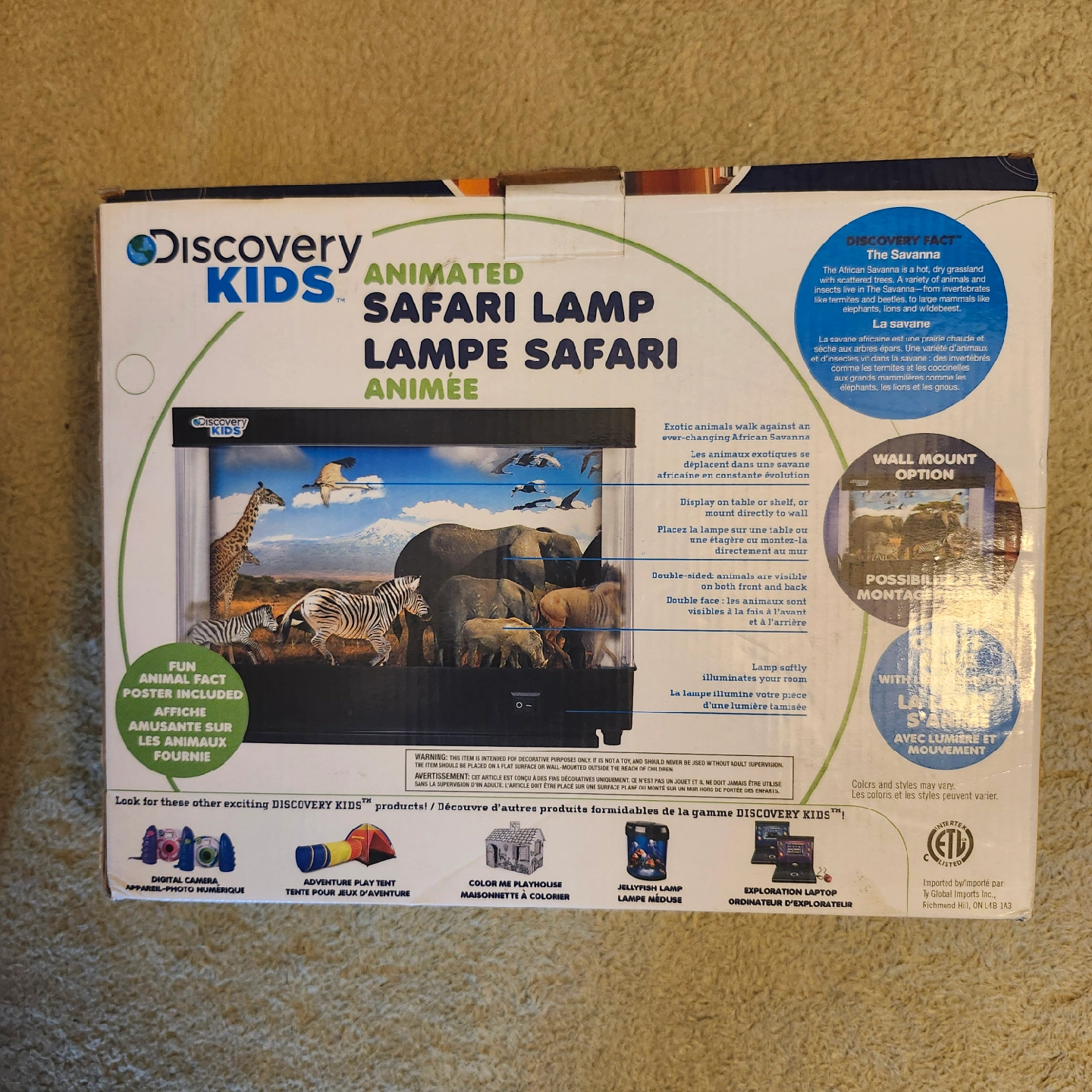 Check out this Discovery Kids animated safari lamp! It brings the savanna to life with light and motion. It's an ideal night light and features a 360-degree animated scene. The box is included!