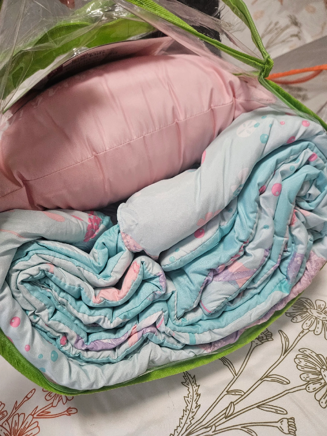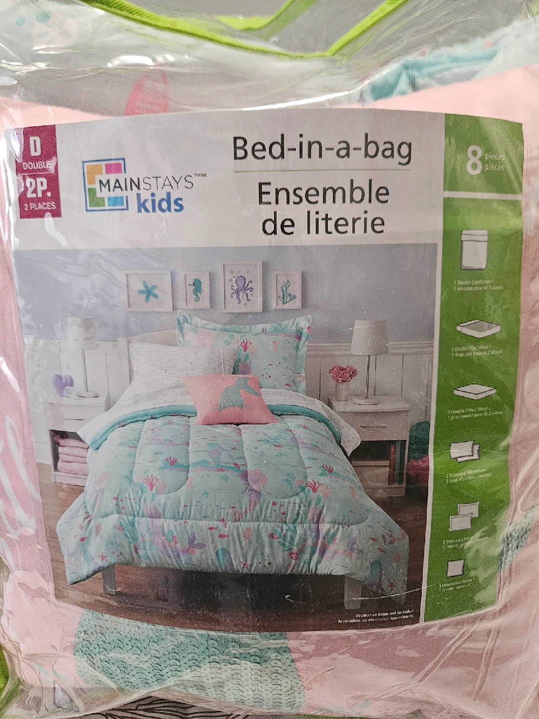 Selling a Mainstays Kids Bed-in-a-bag in double size! This set comes with 8 pieces and is perfect for a kid's room. The set includes a comforter, flat sheet, fitted sheet, pillowcase(s), and sham(s)