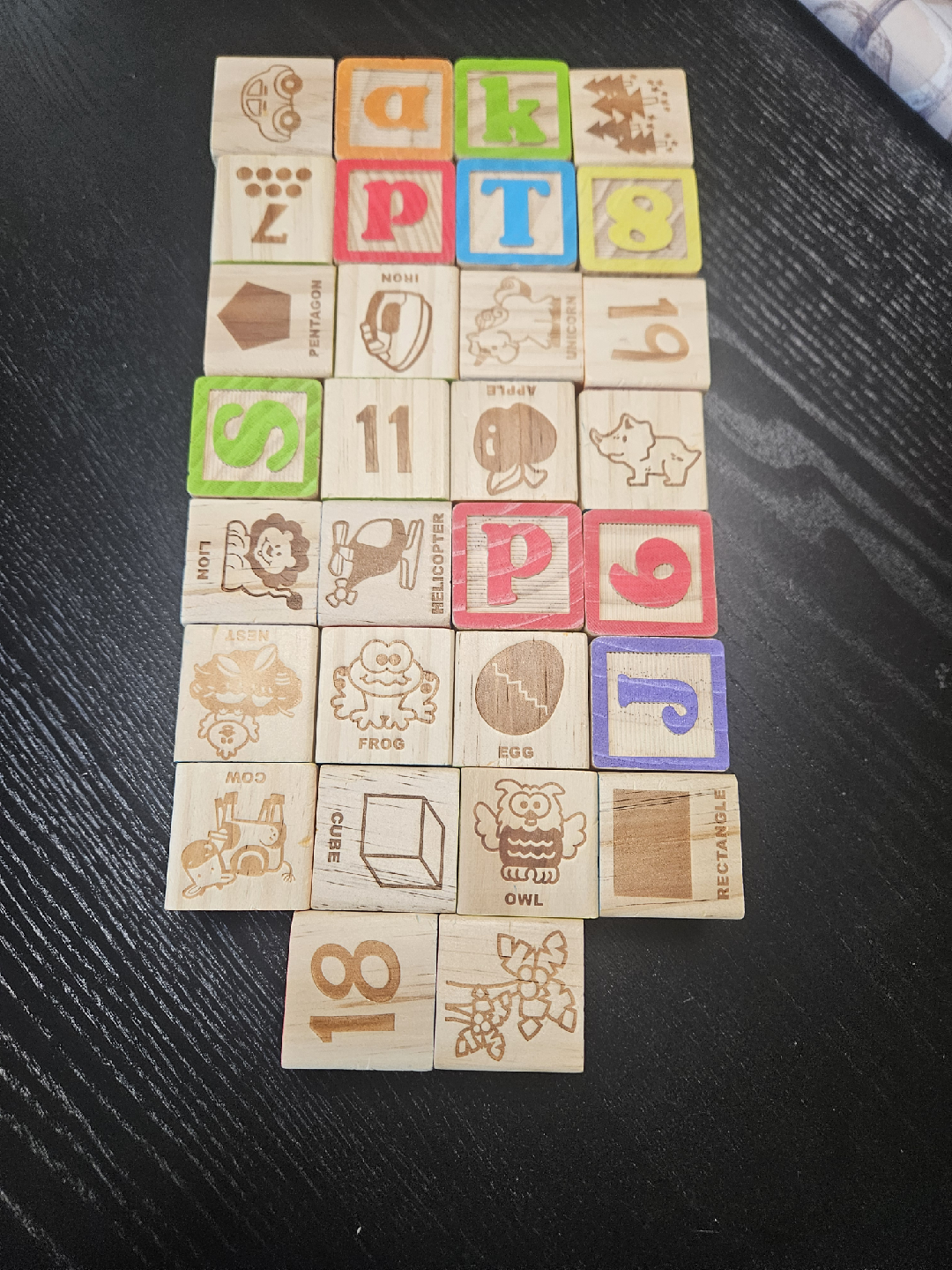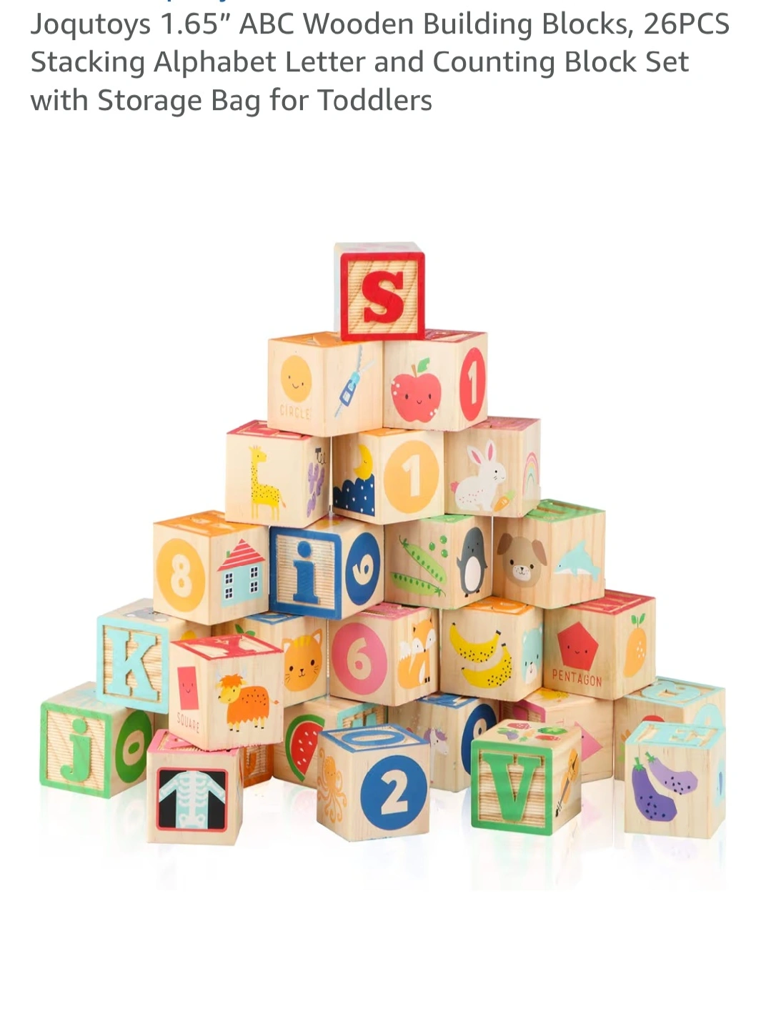 These are Joqutoys ABC wooden building blocks, perfect for toddlers! The set includes 30 pieces of stacking alphabet letter and counting blocks. The blocks are in great condition and ready for a new home!