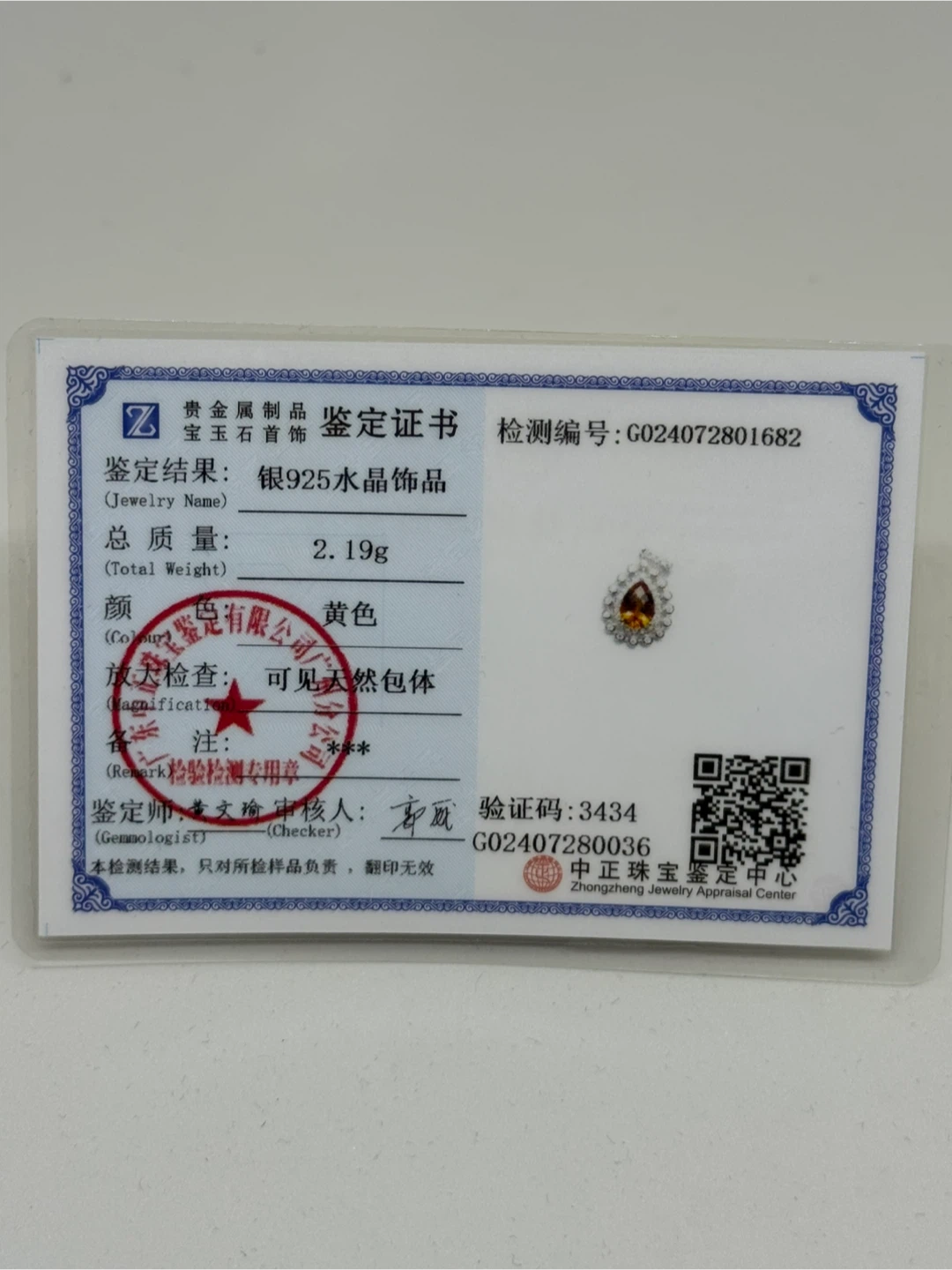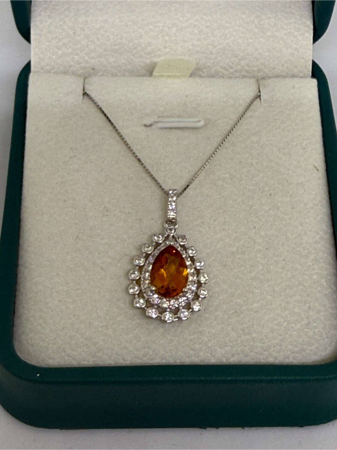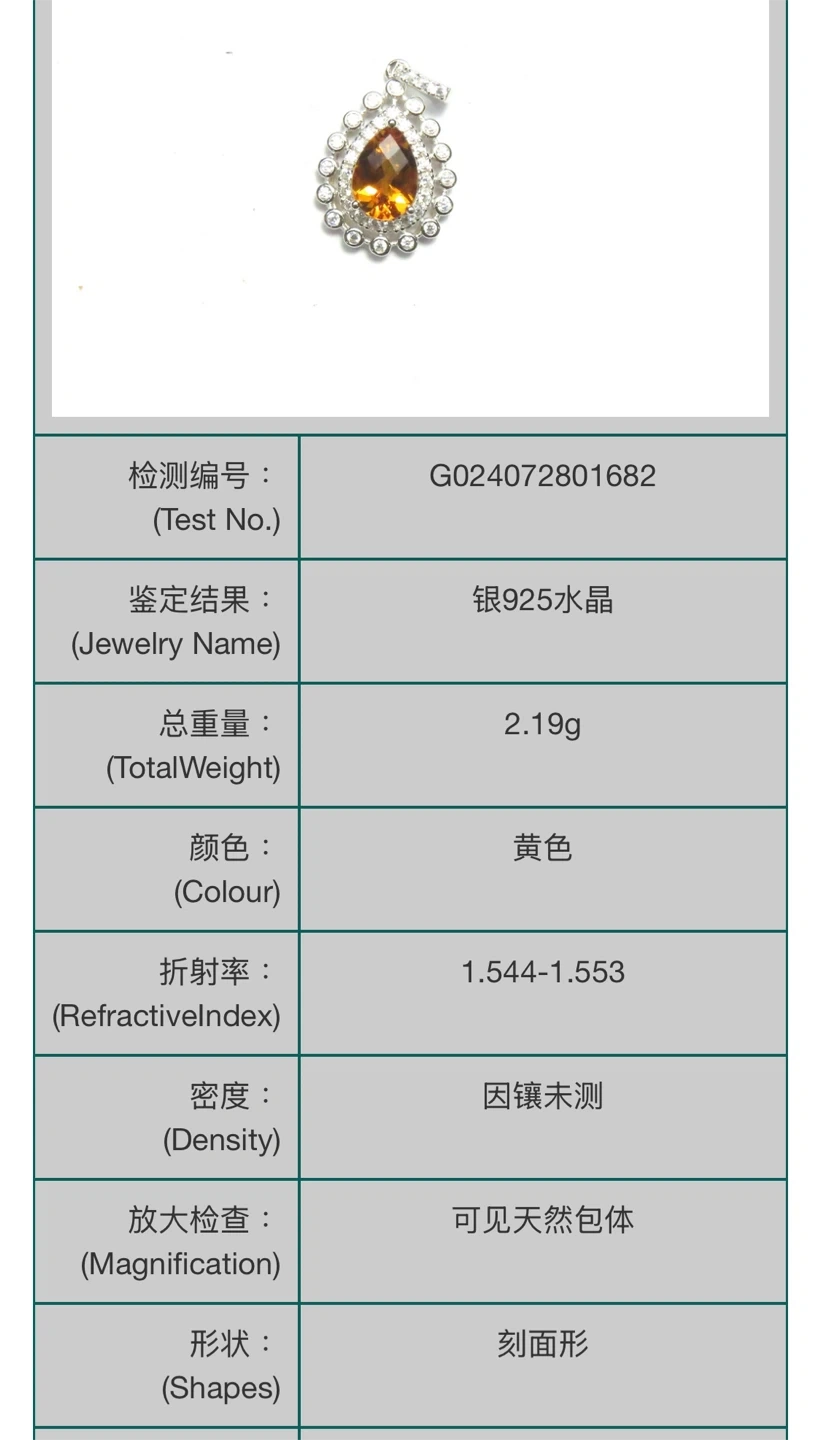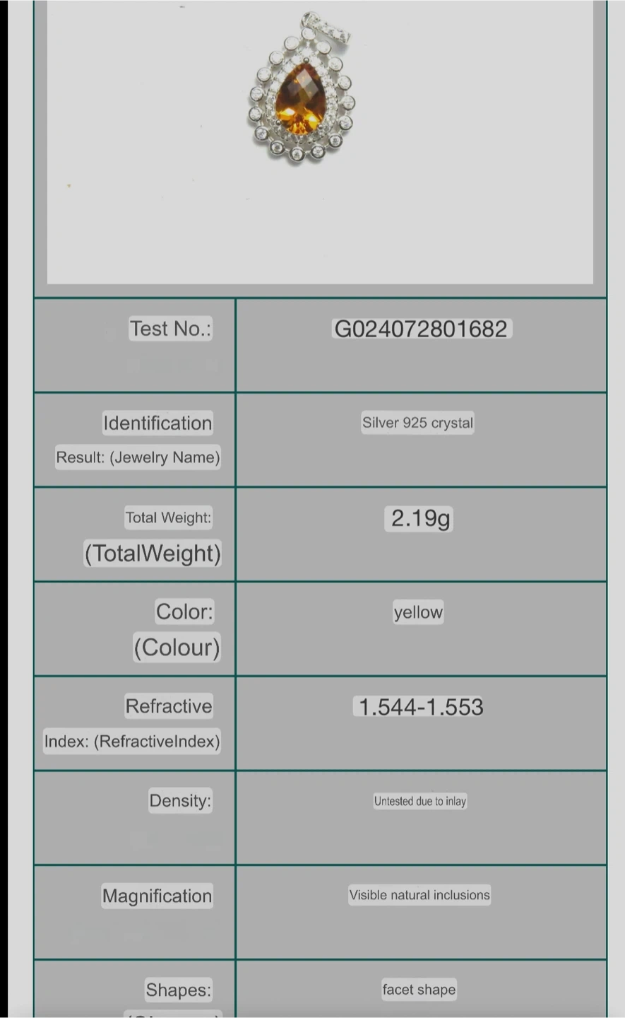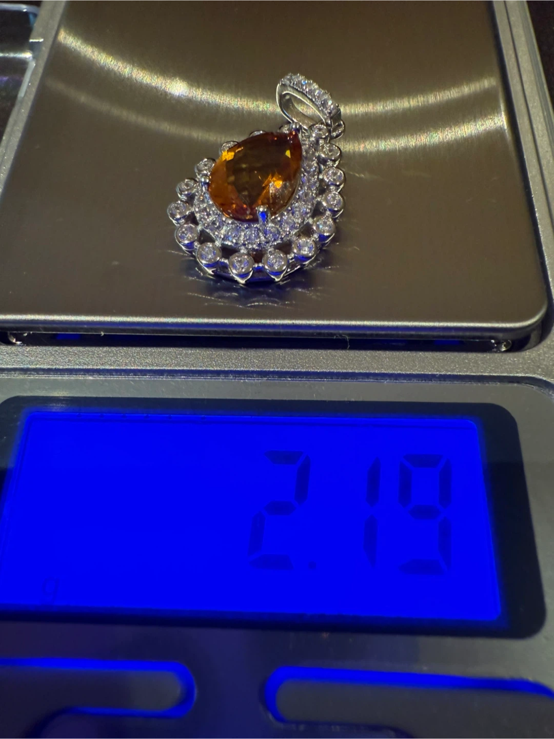 Selling a beautiful silver S925 crystal pendant with a natural citrine stone. It weighs 2.19g and has a facet shape. Visible natural inclusions add to its unique character. The length of the necklace is 40-44cm.