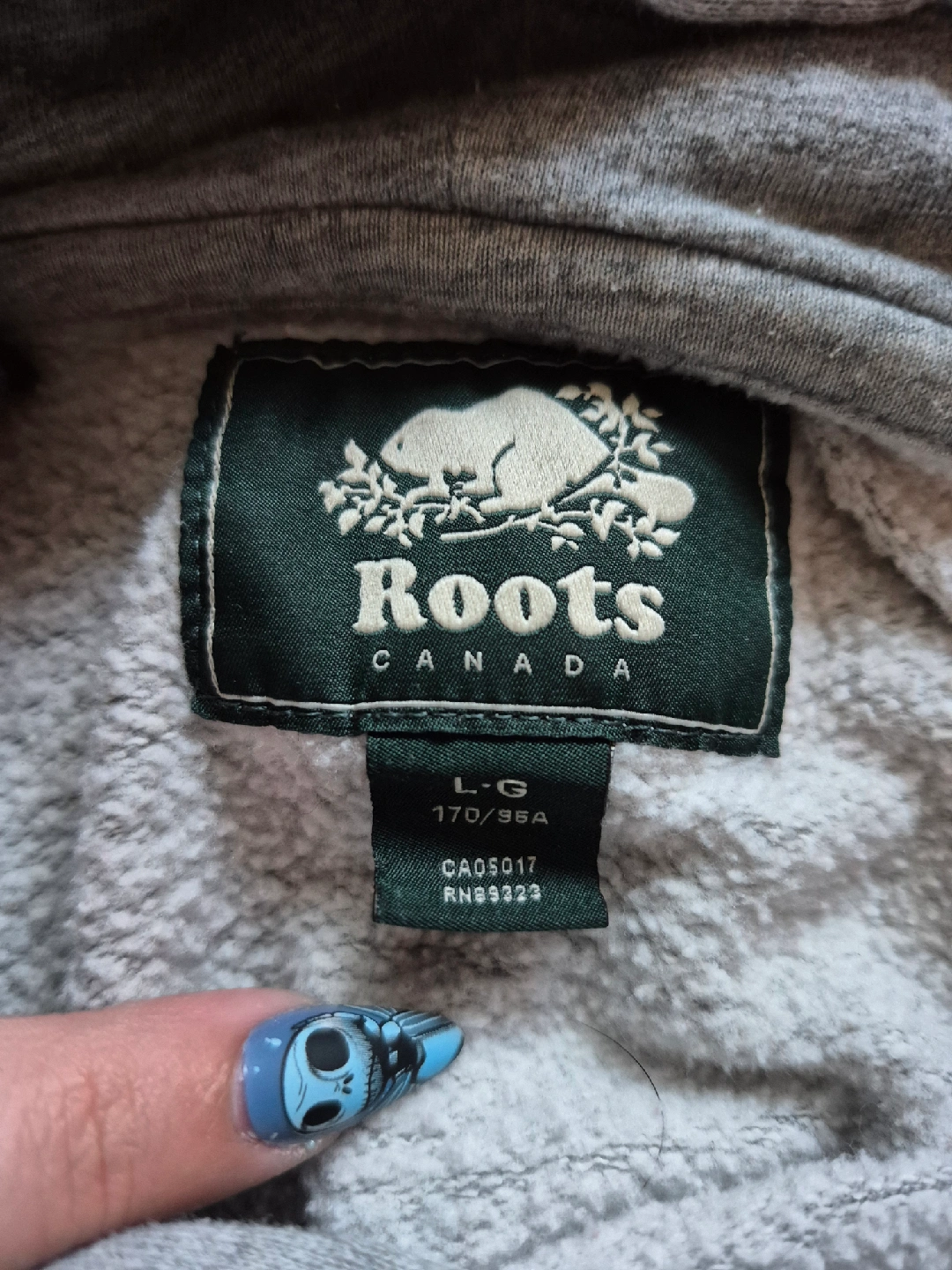 Selling a comfy Roots Canada hoodie! It's a size large and features the classic Roots logo. There's a bit of staining on the front pocket, but otherwise it's in good condition and ready for a new home