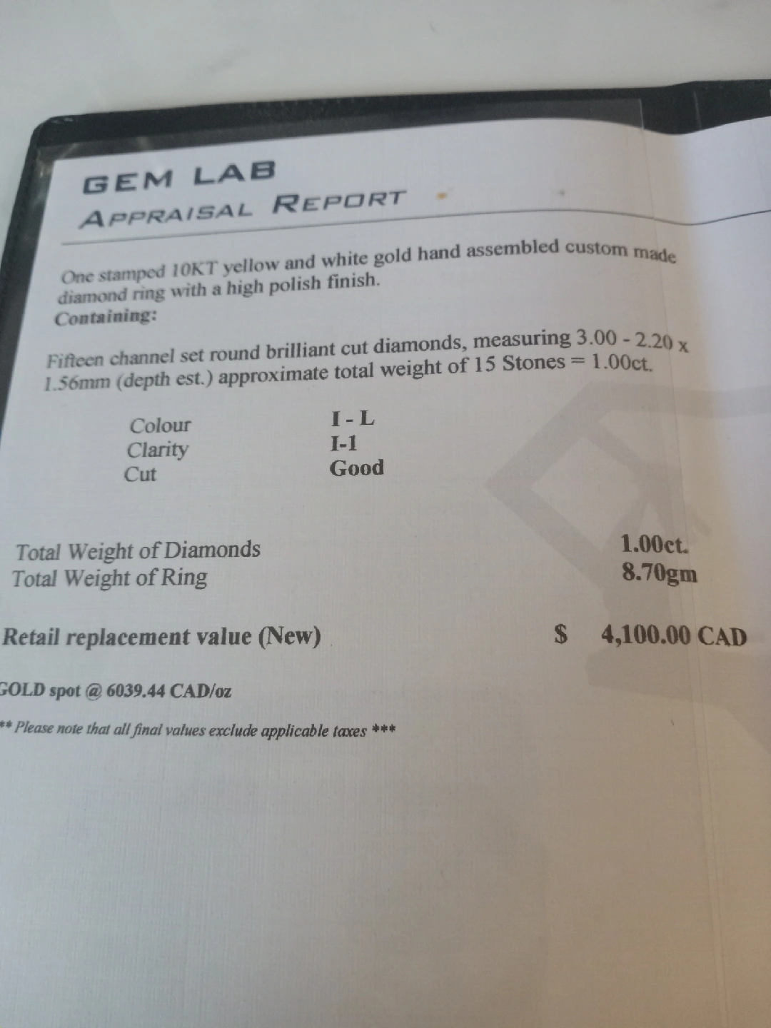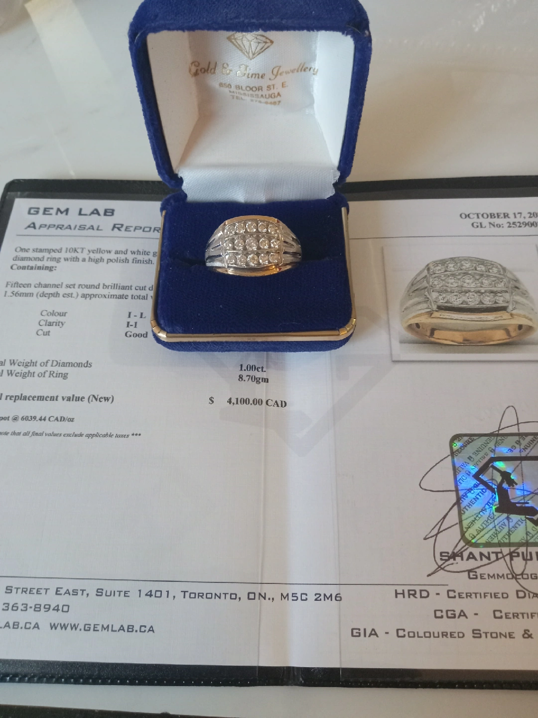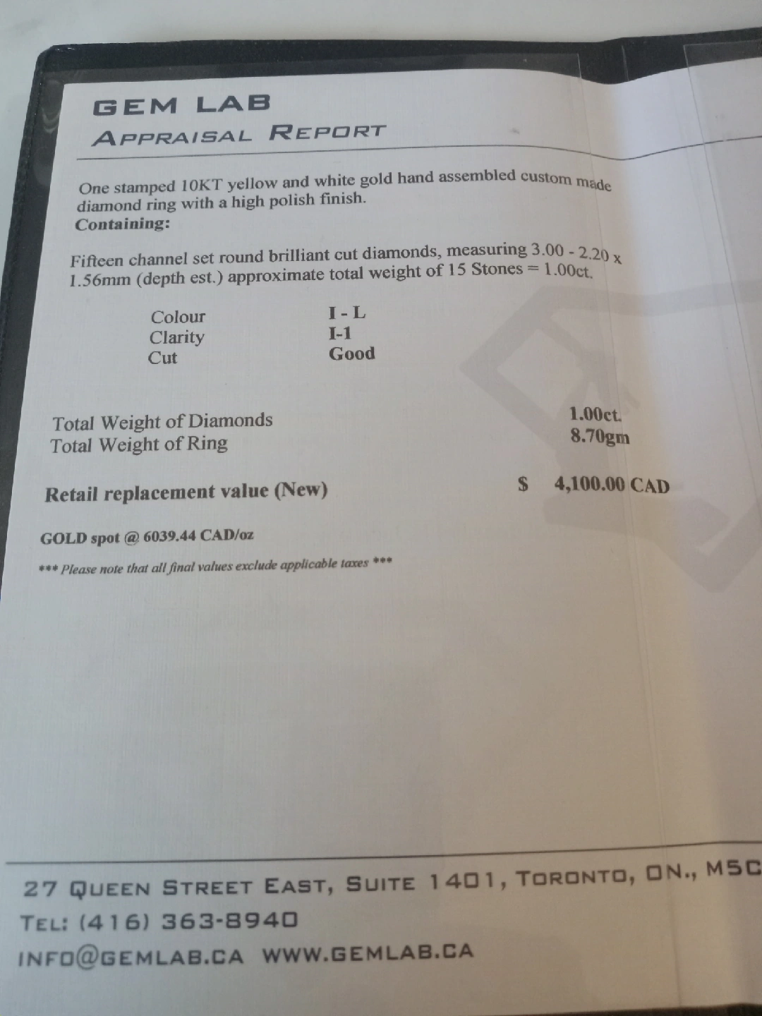 405Selling a beautiful 10KT yellow and white gold hand-assembled custom-made diamond ring with a high polish finish. It features fifteen channel-set round brilliant-cut diamonds, measuring 3.00 - 2.20 x 1.56mm (depth est.), with an approximate total weight of 15 stones = 1.00ct. The clarity is I-1, the colour is I-L, and the cut is good. The total weight of the ring is 8.70gm. Retail replacement value (New) is $4,100.00 CAD