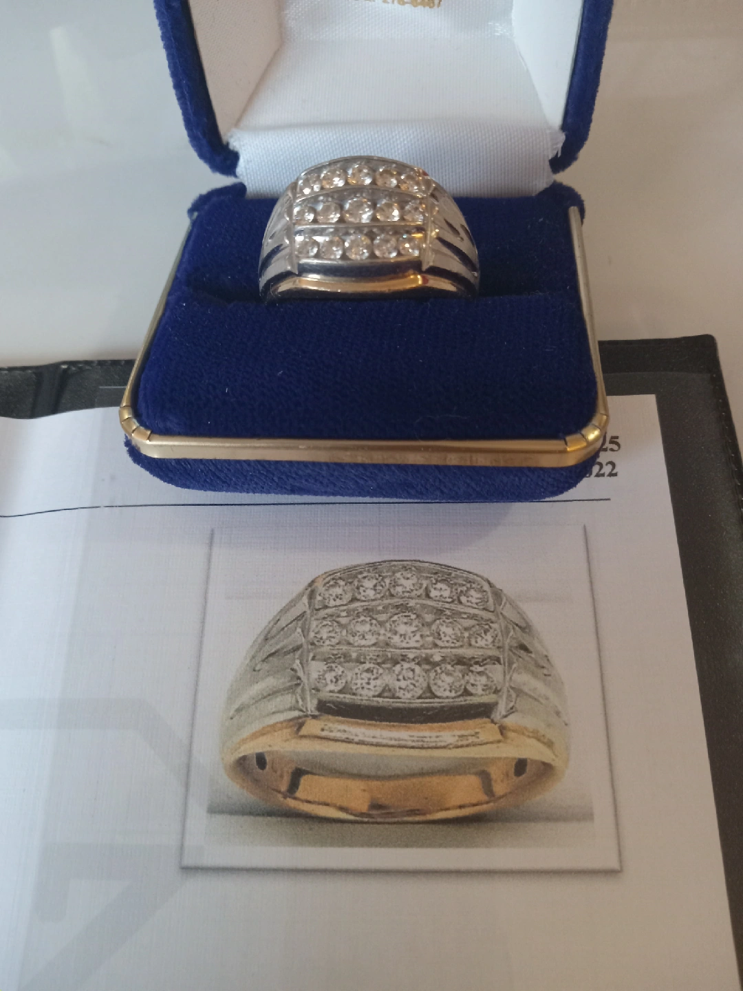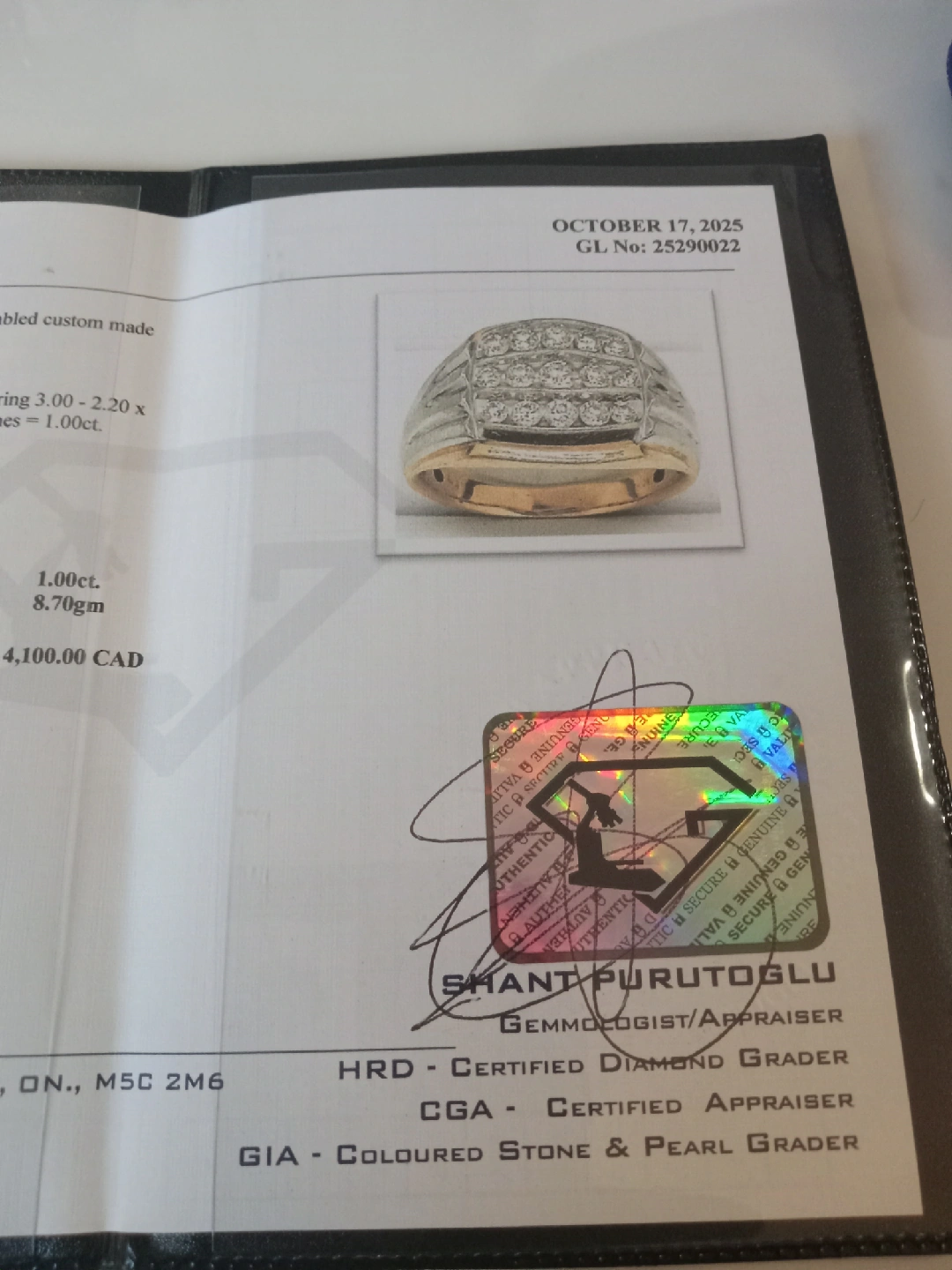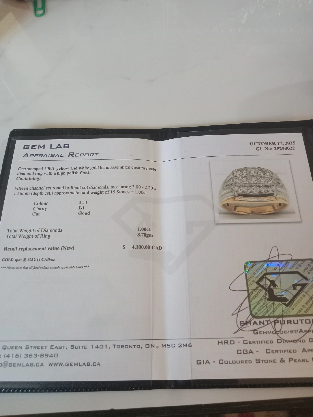 405Selling a beautiful 10KT yellow and white gold hand-assembled custom-made diamond ring with a high polish finish. It features fifteen channel-set round brilliant-cut diamonds, measuring 3.00 - 2.20 x 1.56mm (depth est.), with an approximate total weight of 15 stones = 1.00ct. The clarity is I-1, the colour is I-L, and the cut is good. The total weight of the ring is 8.70gm. Retail replacement value (New) is $4,100.00 CAD