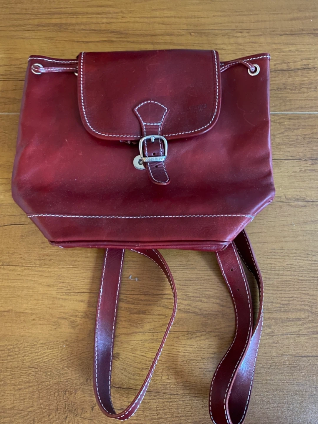 Selling a beautiful I Medici Firenze red leather backpack. It's in great condition and features a stylish design with contrasting white stitching.