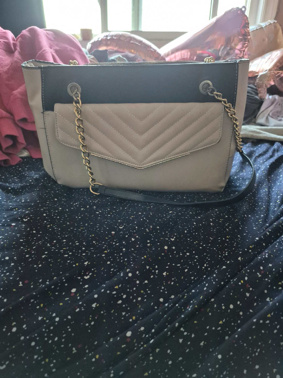 Selling a stylish beige handbag featuring a chic gold chain accent. It has a black top section and a quilted front pocket. Perfect for adding a touch of elegance to any outfit