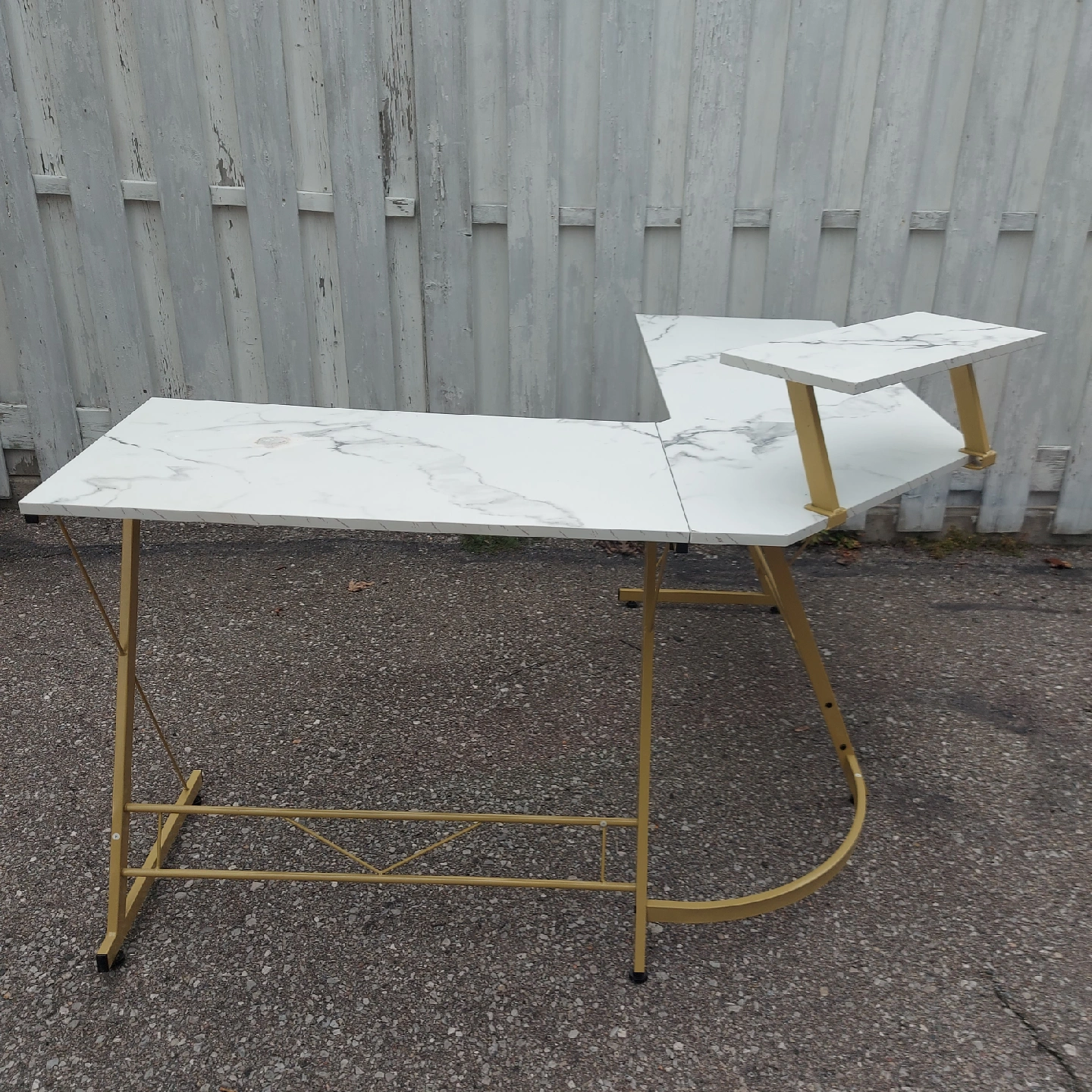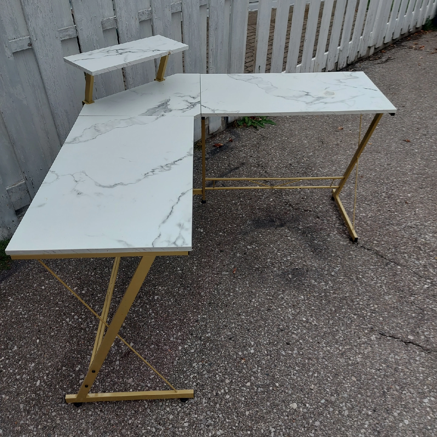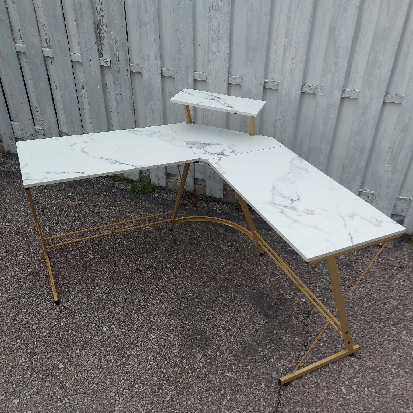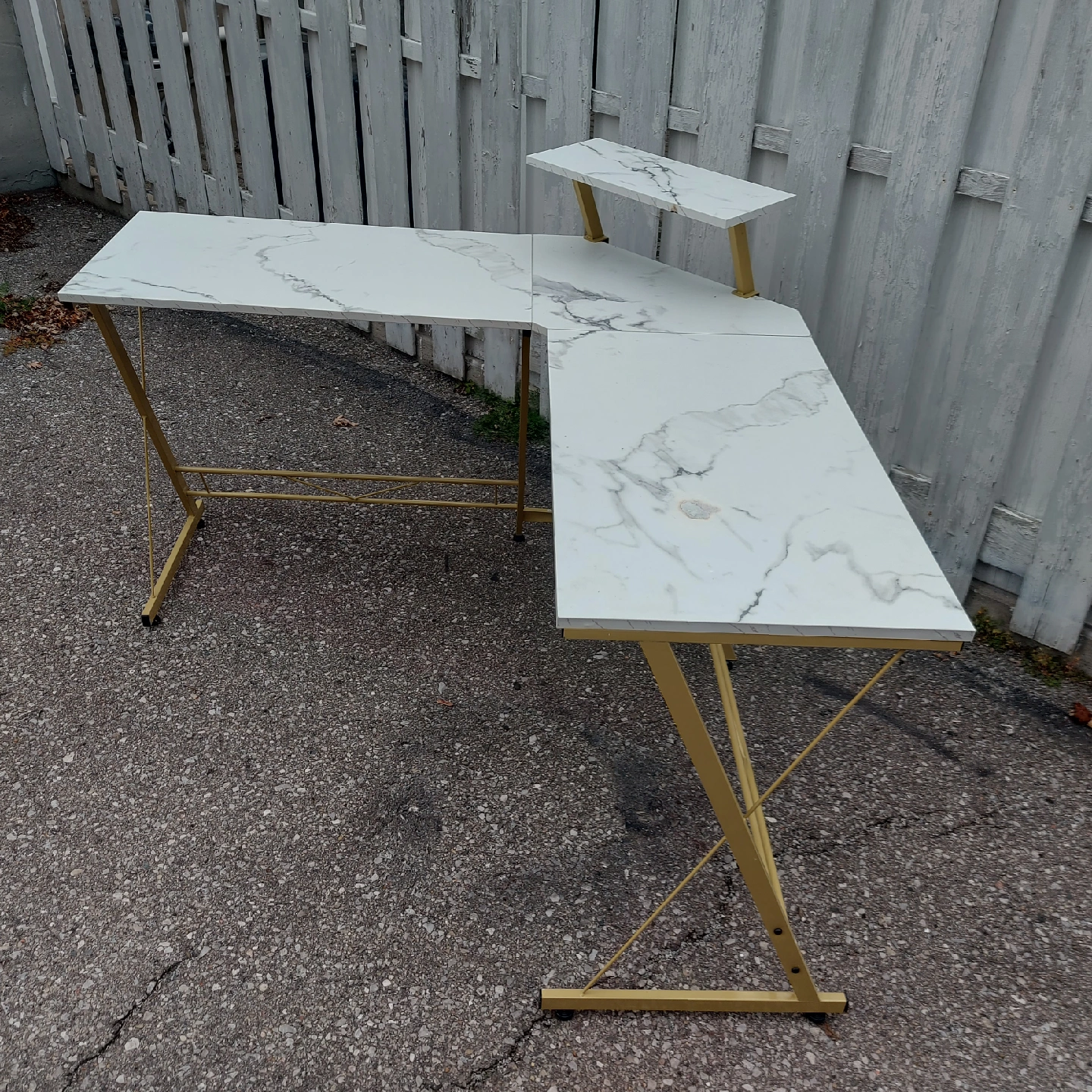 I'm selling an L-shaped corner desk with a sleek white marble top and stylish gold legs.