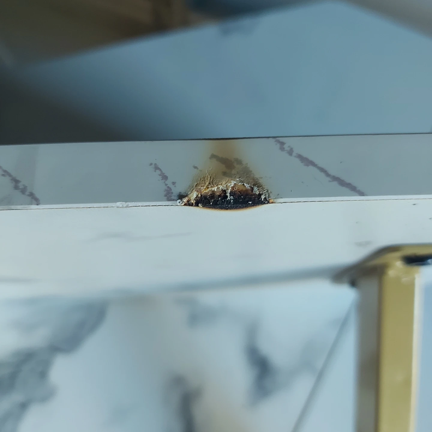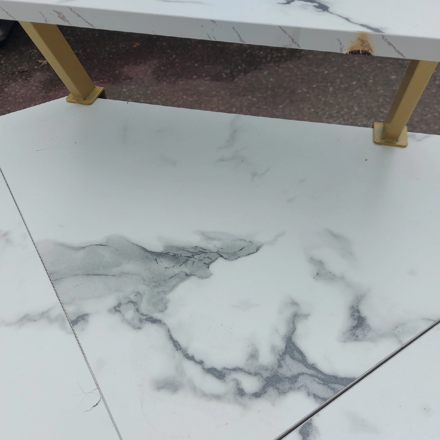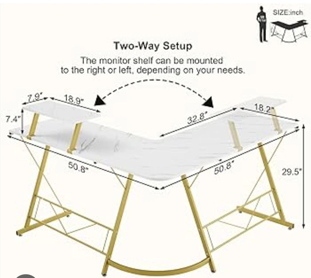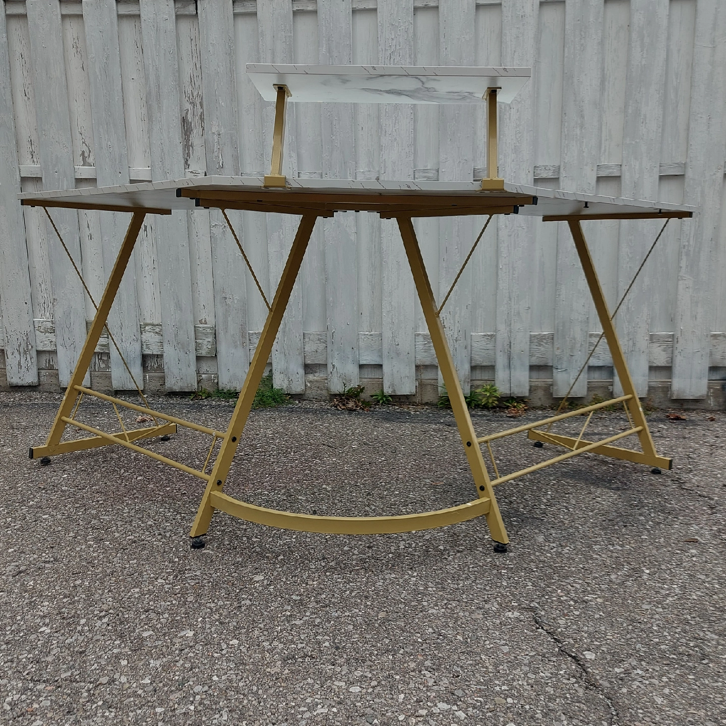 I'm selling an L-shaped corner desk with a sleek white marble top and stylish gold legs.