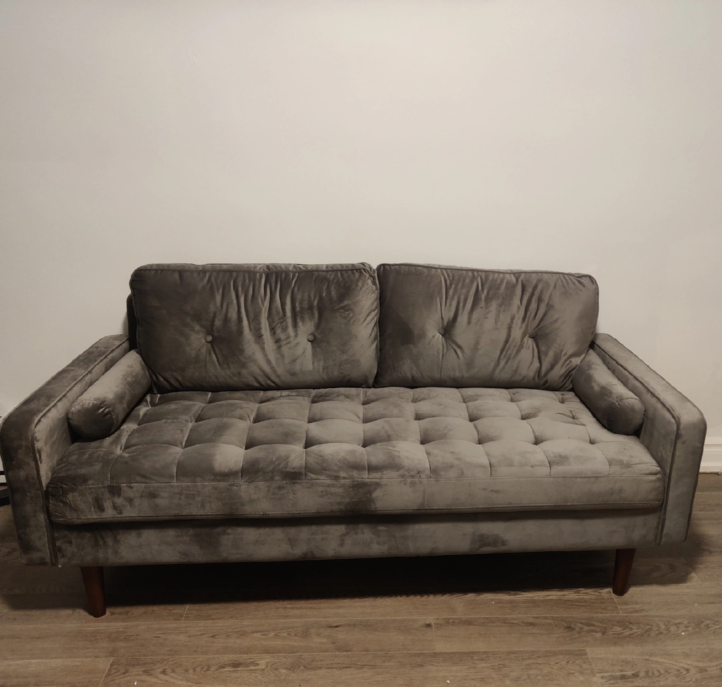 Selling a grey velvet loveseat sofa. It would be perfect for a small space or apartment. The tufted design adds a touch of elegance. It's a stylish addition to any living room! Retails for between $450-600 on Wayfair. Disassembled for easy pickup. Currently in storage, make me an offer.