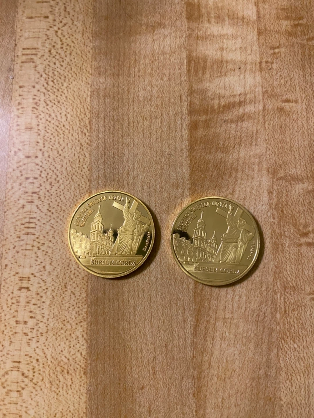 Two collectible coins from the Holy Cross Church in Warsaw, Poland - one features Pope John Paul II and the other features Frederick Chopin. Selling as a set, pick up only in the Trinity Bellwoods area, cash only
