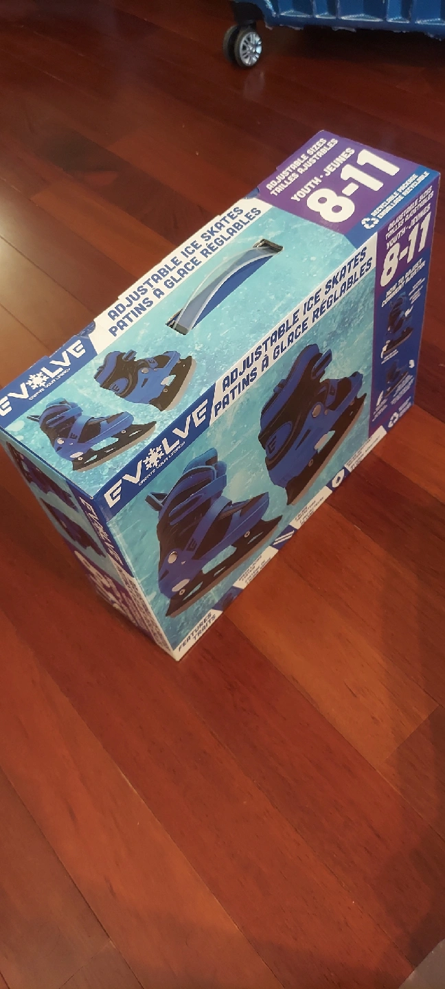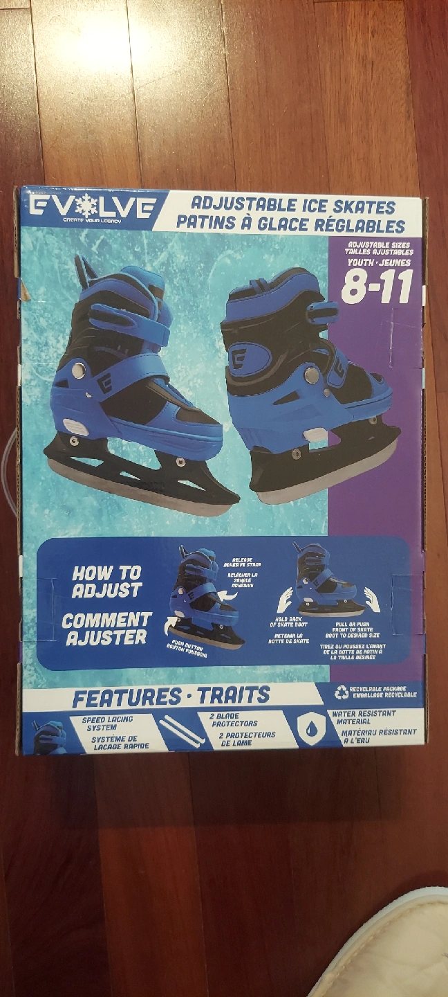 Evolve adjustable ice skates, youth size 8-11. These skates are brand new in the box and ready for the rink! Features include speed lacing system, 2 blade protectors, and water-resistant material. Perfect for young skaters!