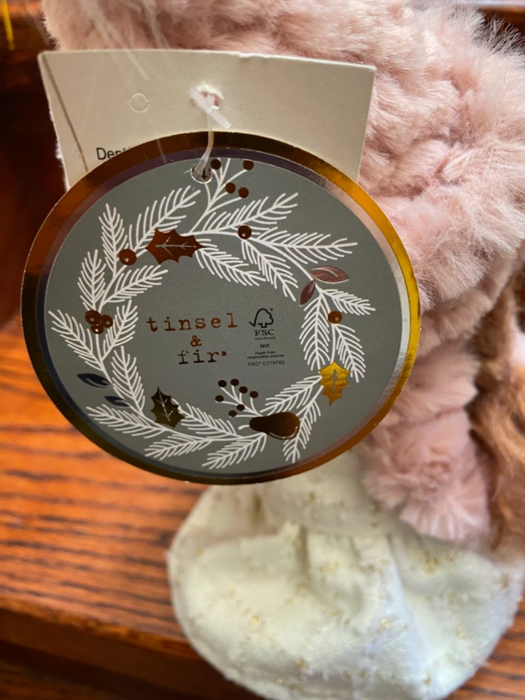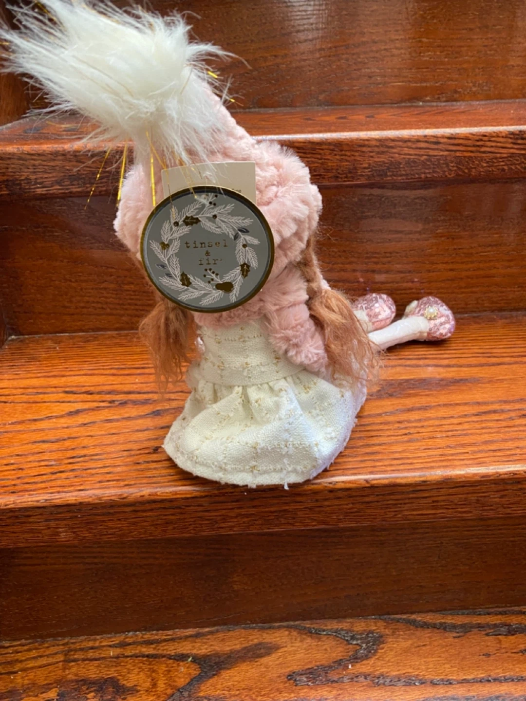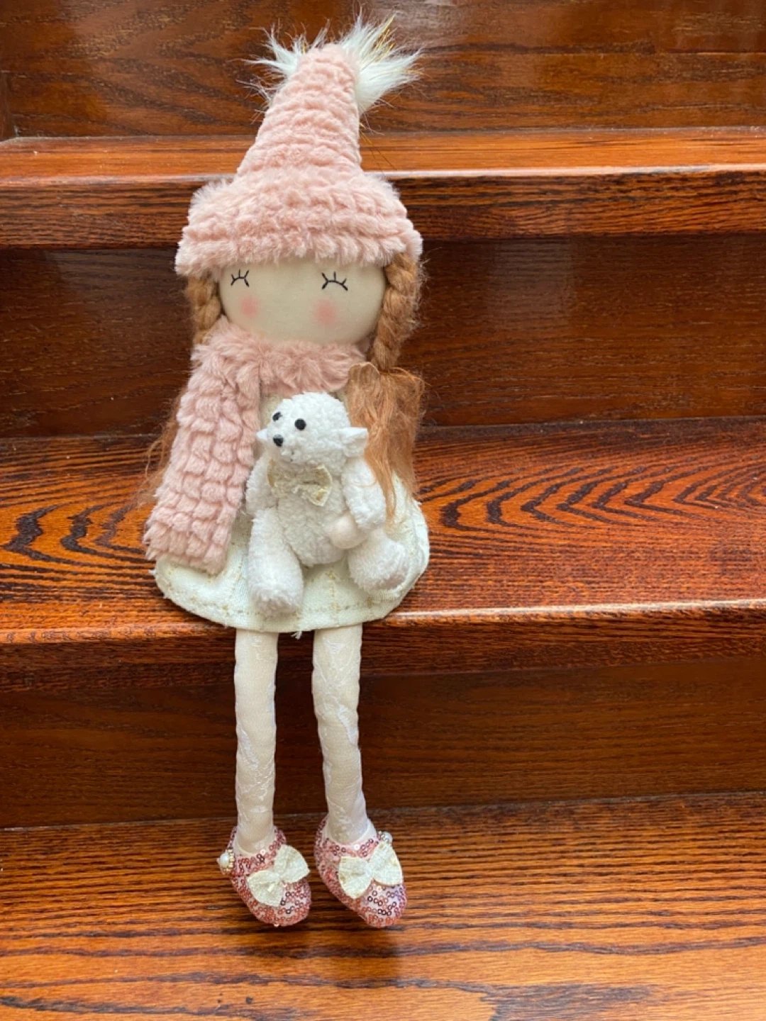 496This is a super cute decorative doll from Tinsel & Fir. She has a pink hat and scarf, and she's holding a little lamb! Perfect for adding a touch of whimsy to any room Girl’s version of Elf on Shelf New Cash Only