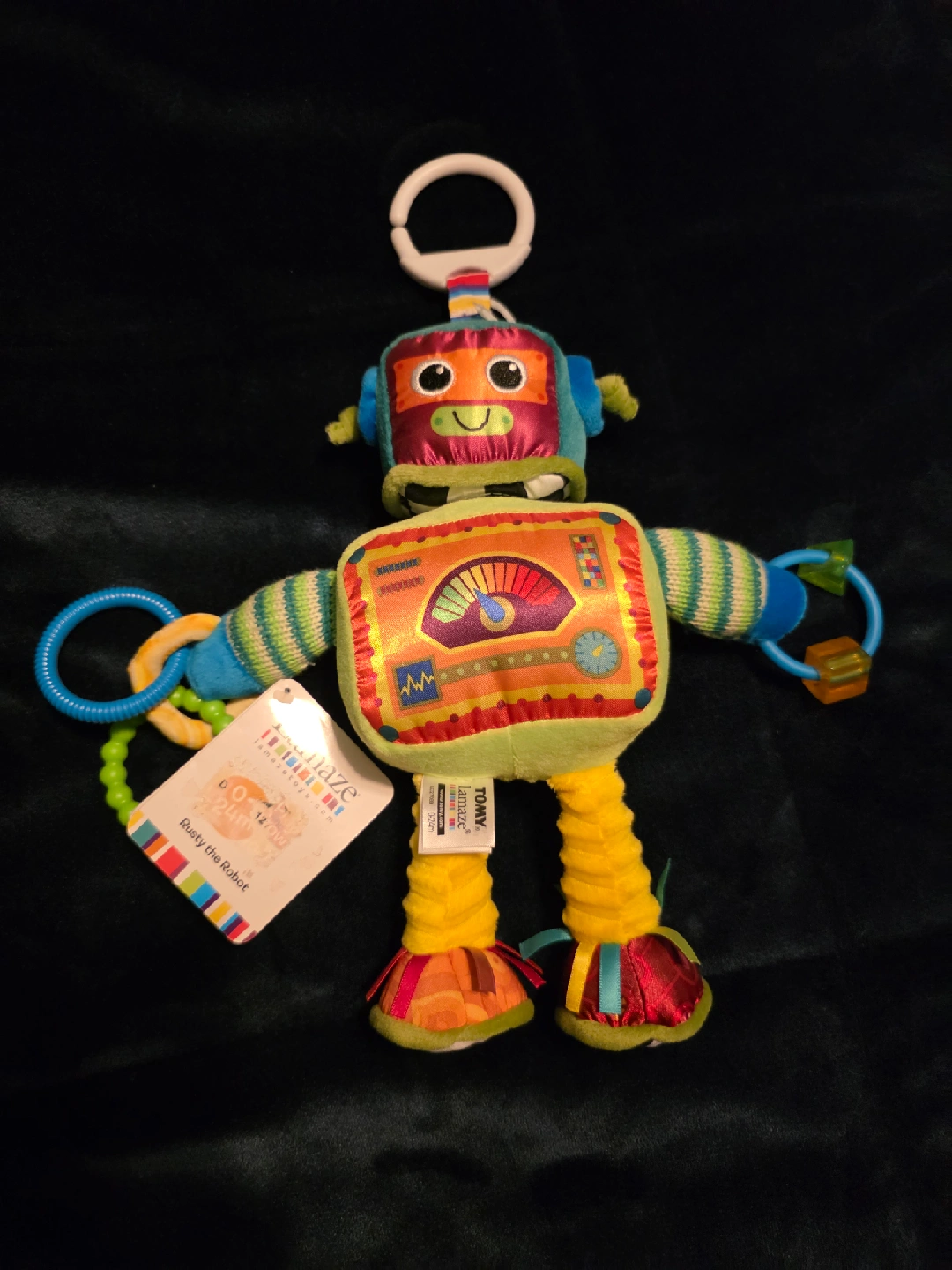 18This is a Lamaze Rusty the Robot toy, perfect for little ones aged 0-24 months! It features bright colours and different textures to stimulate your baby's senses. It also has a clip so you can attach it to a stroller or car seat for on-the-go fun