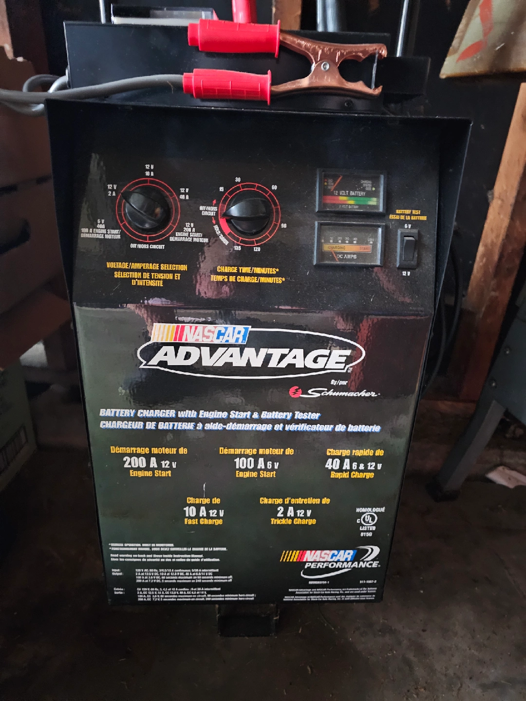Selling a NASCAR Advantage by Schumacher battery charger with engine start and battery tester. It can do engine starts at 200A 12V and 100A 6V. It also has rapid charge at 40A 6 & 12V and trickle charge at 2A 12V
