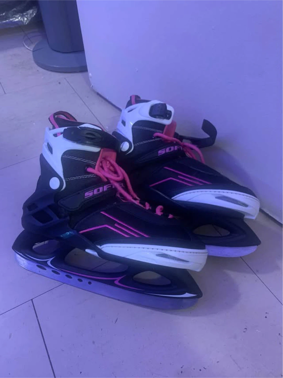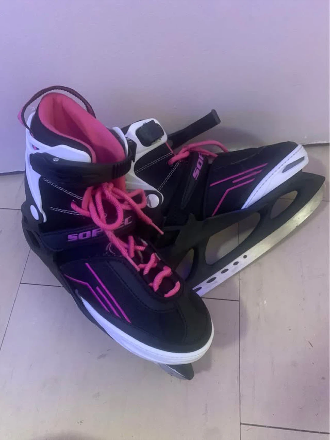 Selling a pair of Sofia ice skates in black and pink. They are in good condition and ready for the rink! The skates have a stylish design with pink accents, perfect for adding a pop of colour to your skating gear