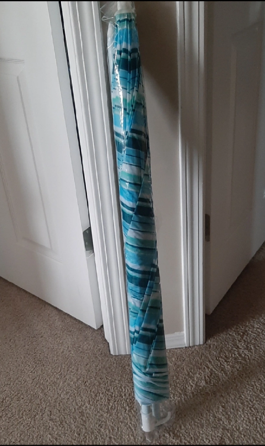 Here's a blue and white striped Beach umbrella. It's still in its original packaging and has never been used. Perfect for those sunny days at the beach! Asking $10.00 Pick up in Leduc.