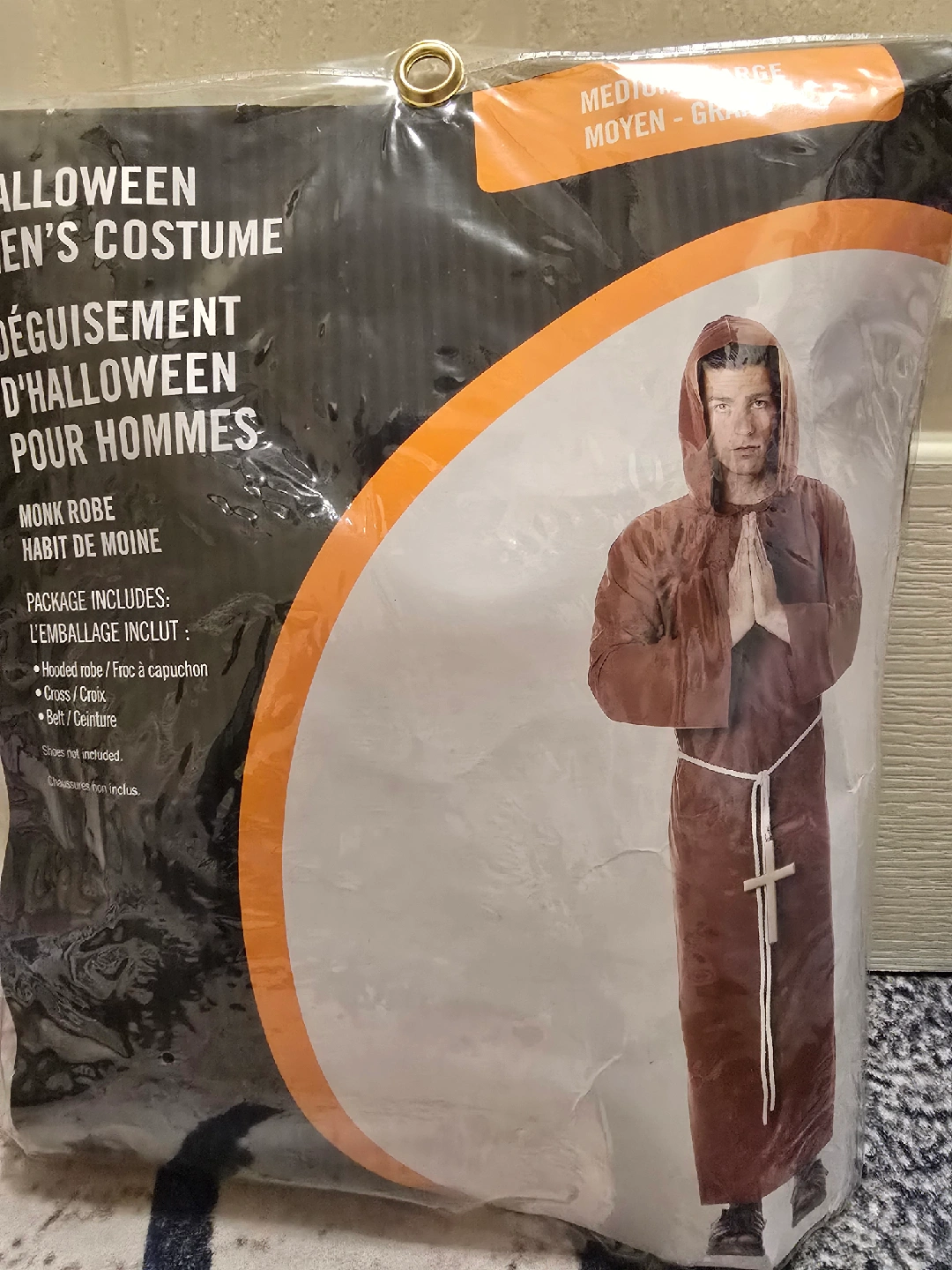 10Selling a Halloween men's monk costume in size medium-large. The package includes a hooded robe and cross. Belt and shoes are not included