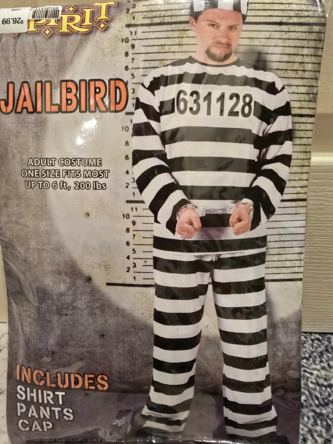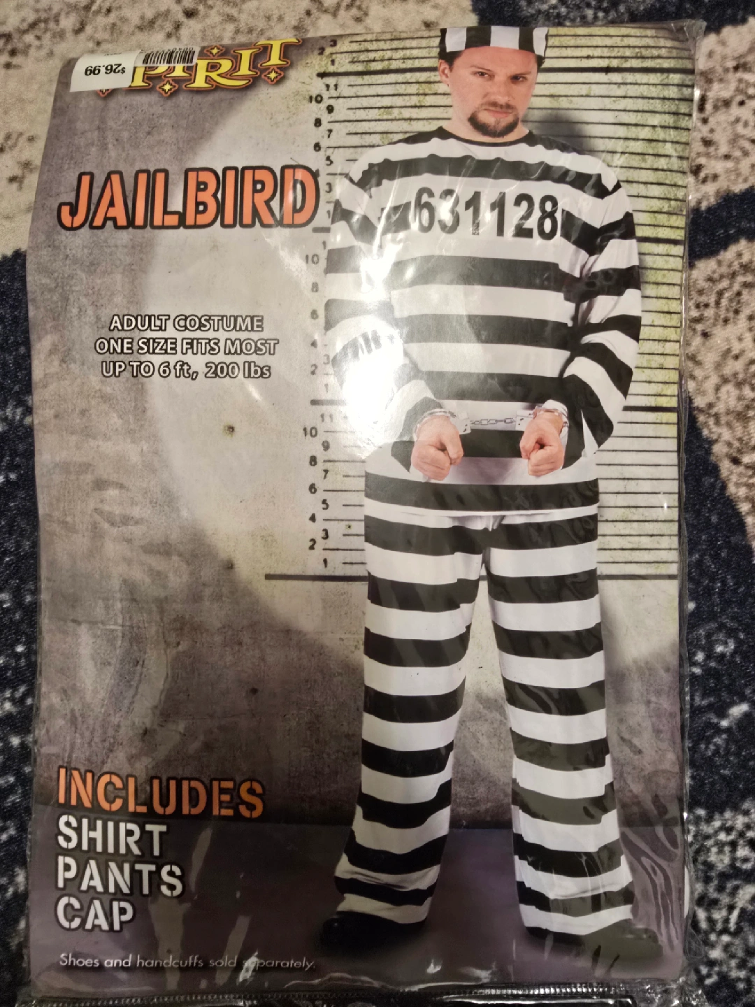 Selling a Jailbird adult costume. One size fits most, up to 6 ft, 200 lbs. Includes a shirt, pants, and cap