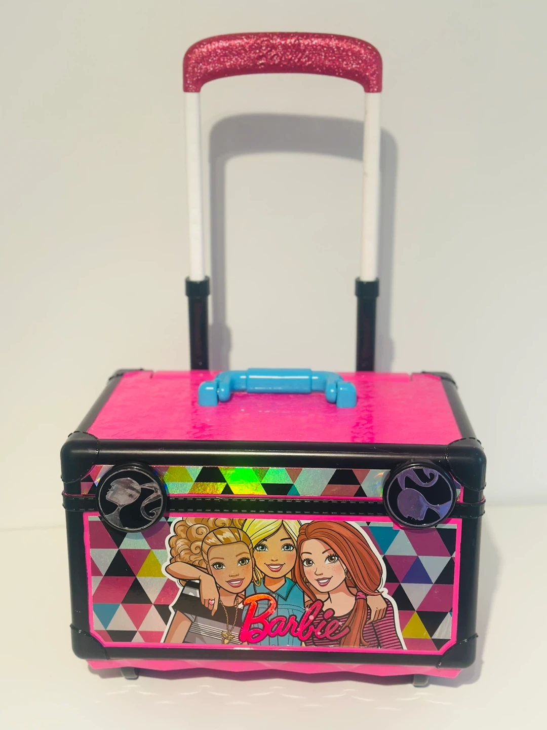 60Selling a cute Barbie rolling vanity case! It's pink and has a fun Barbie design on the front. Inside, there's a mirror and compartments for storing makeup and accessories. Perfect for any Barbie fan!