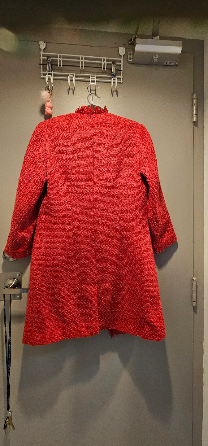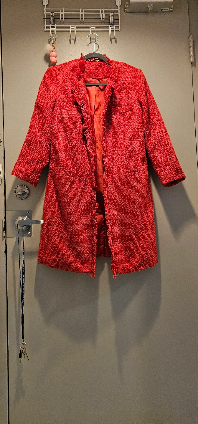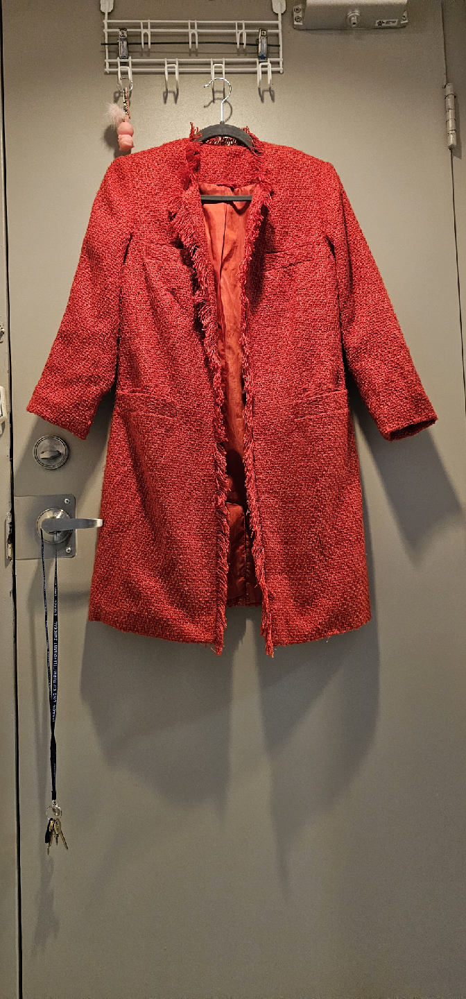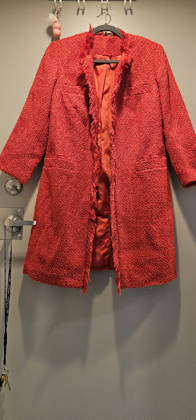 Selling a lovely red tweed coat. It's in great condition and ready for a new home! The tweed texture gives it a classic and stylish look, perfect for adding a pop of colour to your wardrobe. It's a great piece for layering during the cooler months!