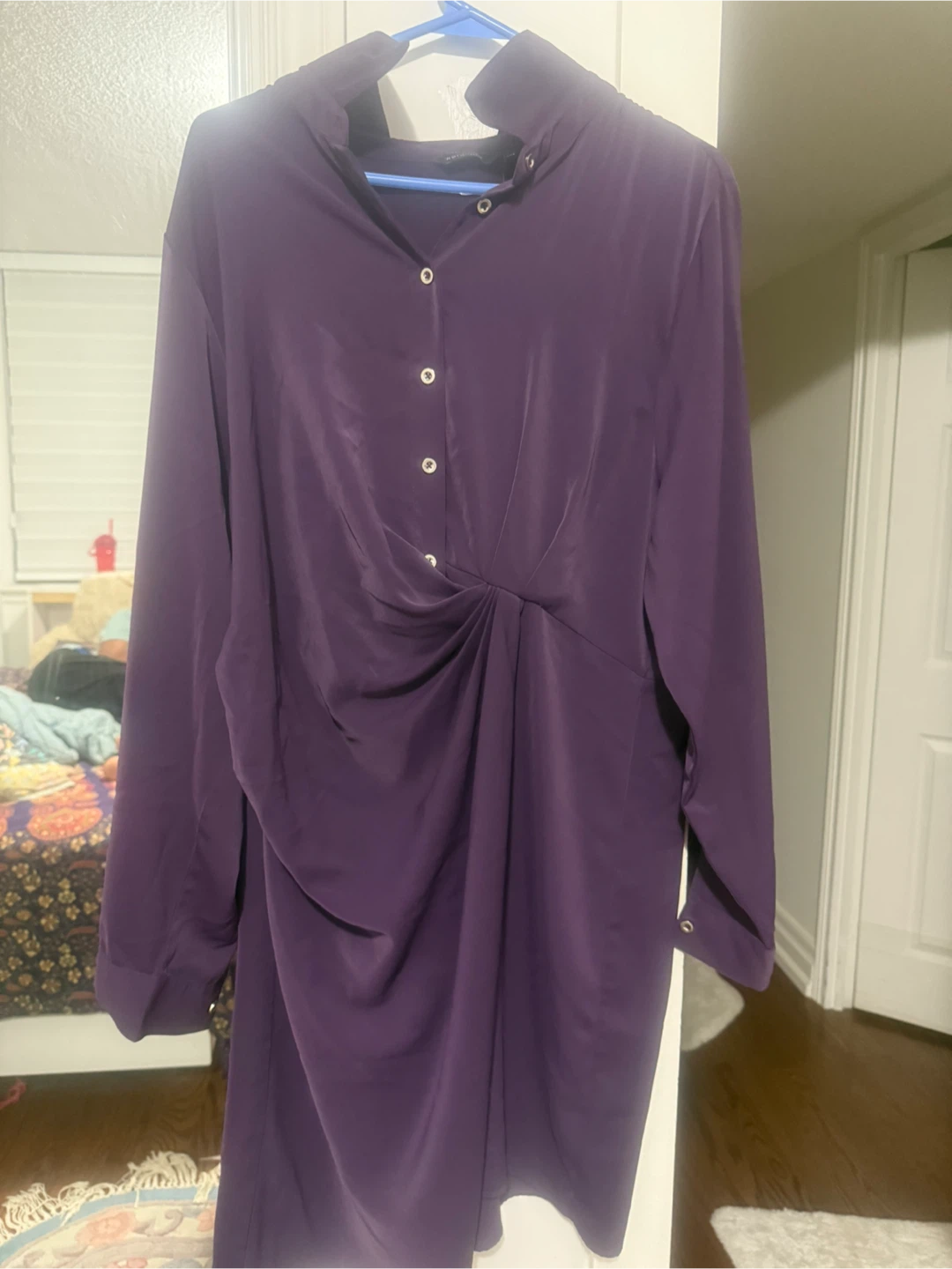 A lovely purple dress in great condition! It has long sleeves and a button-up front. The waist is cinched, giving it a flattering shape. Perfect for any occasion.
