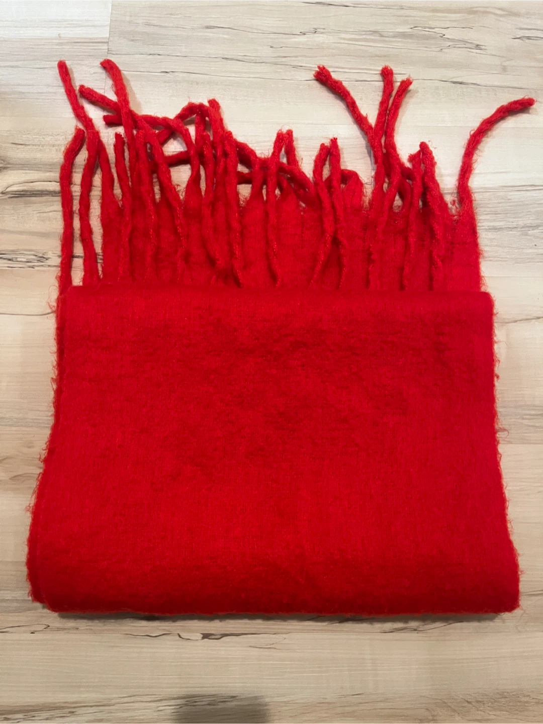A cozy red scarf with fringe detail. Perfect for adding a pop of colour to your outfit and staying warm on chilly days! It's in great condition and ready for a new home