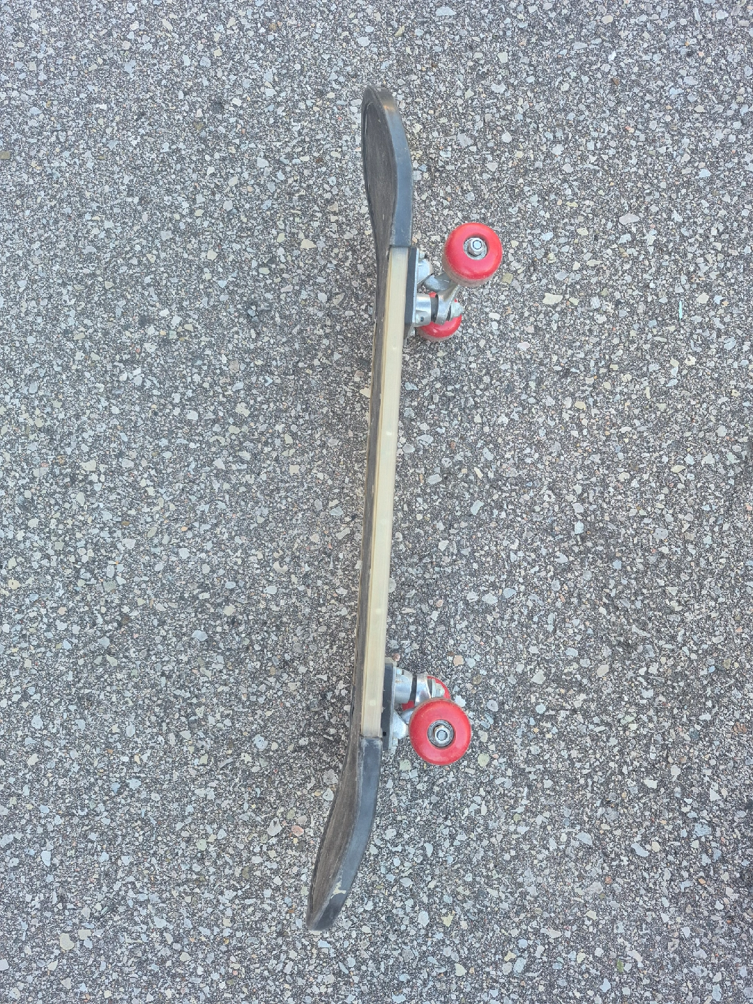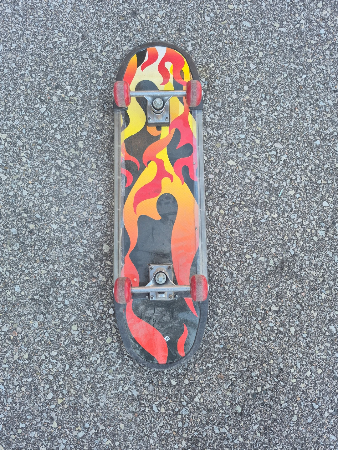 60Selling a used skateboard with a cool flame design on the bottom. It has red wheels and shows signs of wear from use, but it's still ready to ride! Perfect for beginners or anyone looking for a fun board.