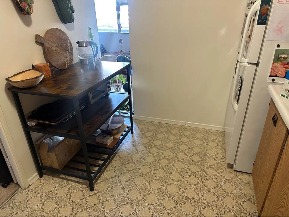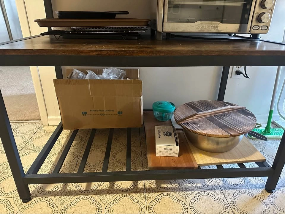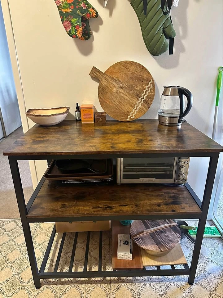 Rustic brown and black kitchen island made of particleboard and steel. Dimensions are 59.9D x 100.1W x 89.9H cm. The worktop measures 23.6” x 39.4” and provides plenty of space for meal prep or small appliances like a toaster or coffee machine. Includes three tiers of storage: a top surface for display, a middle shelf for kitchen appliances, and a lower grid shelf for bakeware or storage boxes. Adjustable feet keep it stable on uneven floors and prevent scratches. Height is 35.4”, making it suitable as a breakfast table, coffee bar, or bar table. Excellent condition.