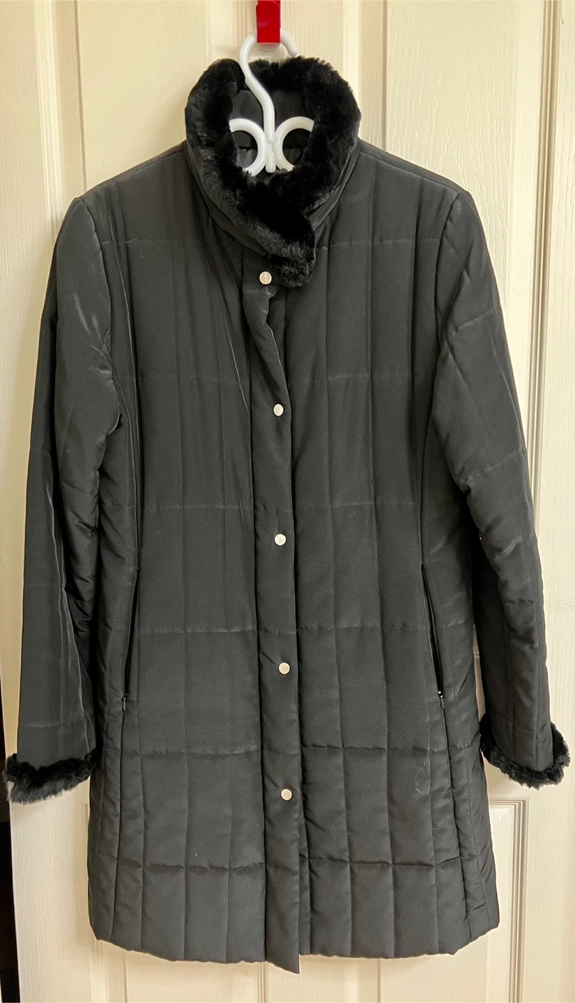 A posh black quilted winter coat! It features a faux fur trim around the collar and cuffs. Perfect for staying warm and stylish!