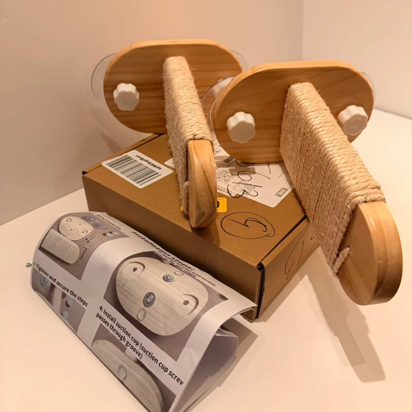 Selling a set of cat wall steps! These are made of wood and wrapped in rope, perfect for your kitty to climb and play. They attach to the wall with suction cups for easy installation. Comes with all accessories and installation steps.