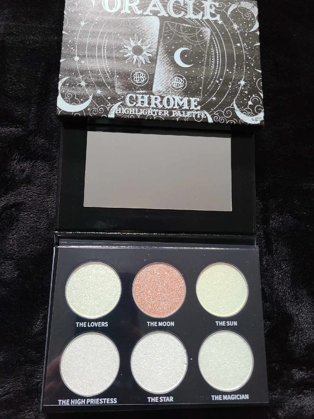 Selling a brand new Bella beaute bar Oracle Chrome Highlighter Palette! The palette includes shades such as The Lovers, The Moon, The Sun, The High Priestess, The Star, and The Magician. Perfect for adding a shimmery glow to your makeup look!