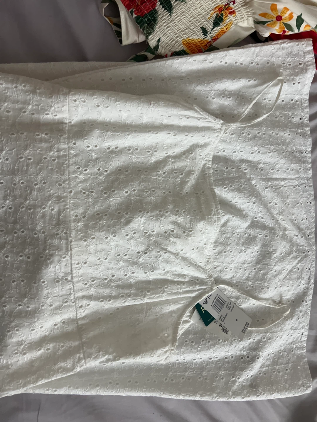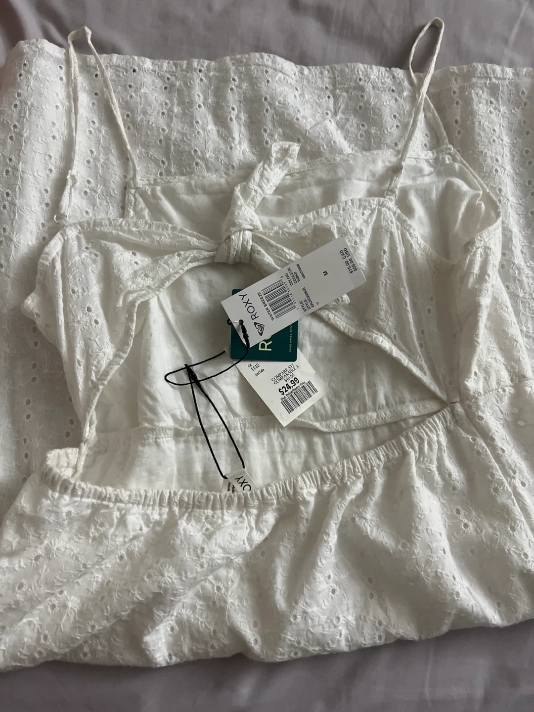 Selling a super cute white Roxy dress! It's size medium and features a lovely eyelet design. The dress has a tie back detail. Originally bought for 25$