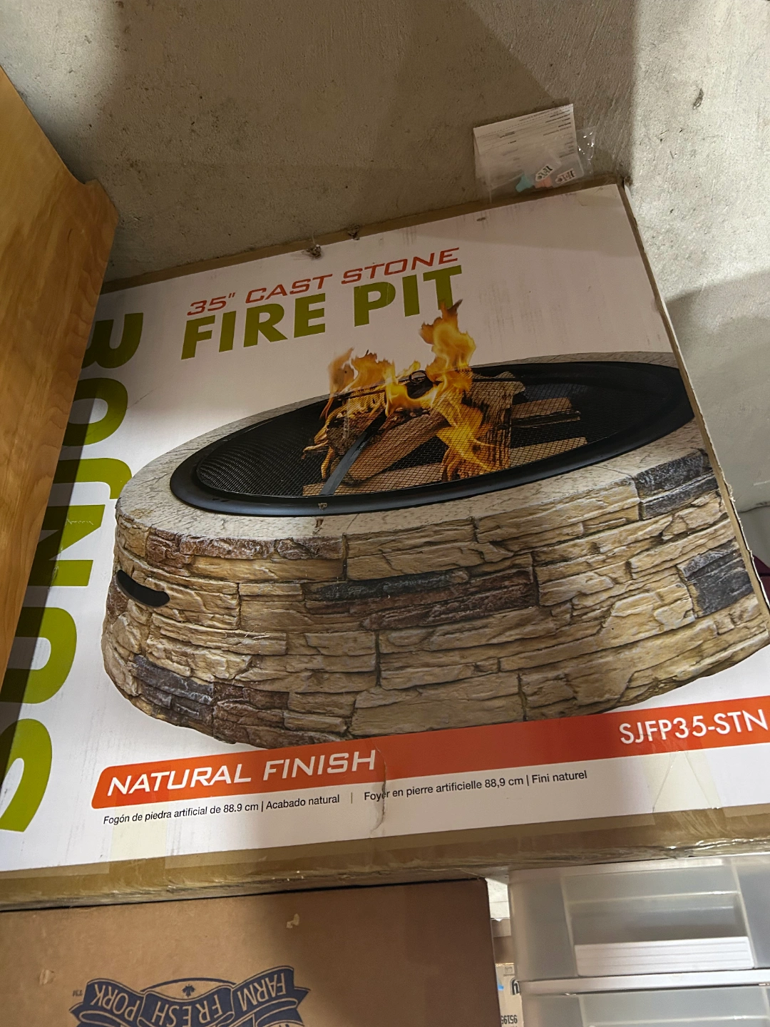 Selling a brand new Sun Joe 35" Cast Stone Fire Pit! It's still in the box and has never been used. Key features include: - Fire bowl withstands temperatures up to 1,112°F - Wire mesh screen protects against sparks and provides an open view of the flame - Includes a 26" spark screen safety removing poker for lifting and placing the screen. Brand new unopened Model number: SJFP35-STN