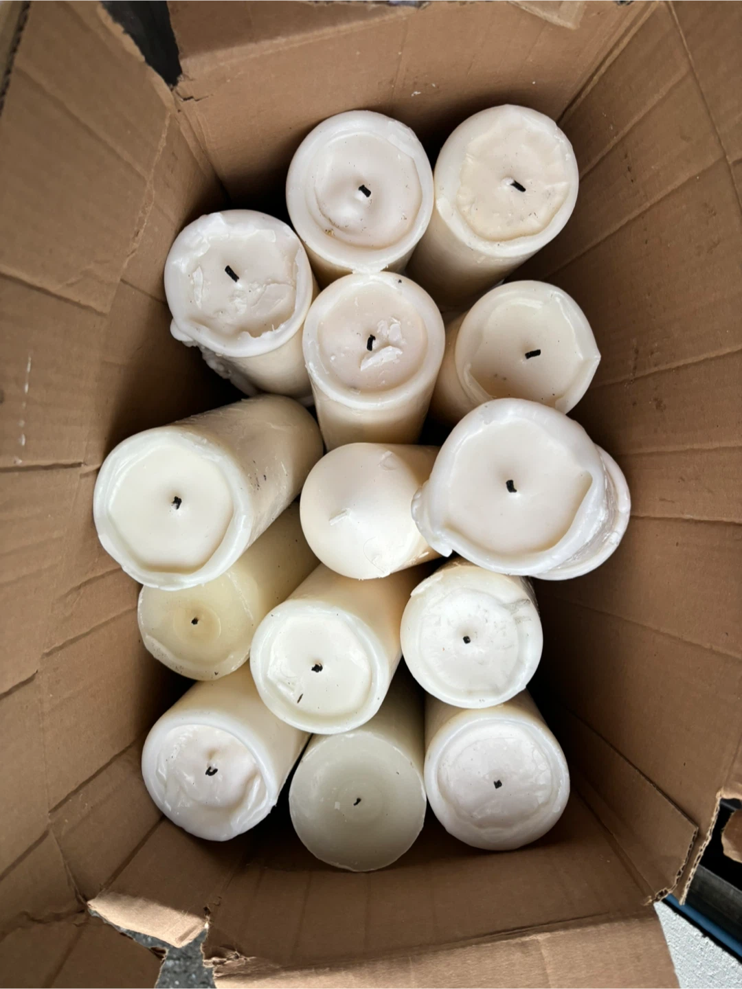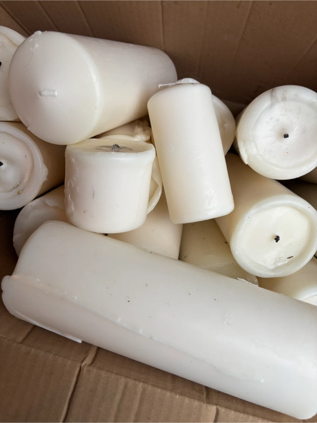 I have a box of 14 white pillar candles for sale. They're in good condition and ready to add some ambiance to your space. Each candle is about 8inches tall and 2 inches in diameter. Perfect for creating a cozy atmosphere! They can also be melted and used for whatever you may need