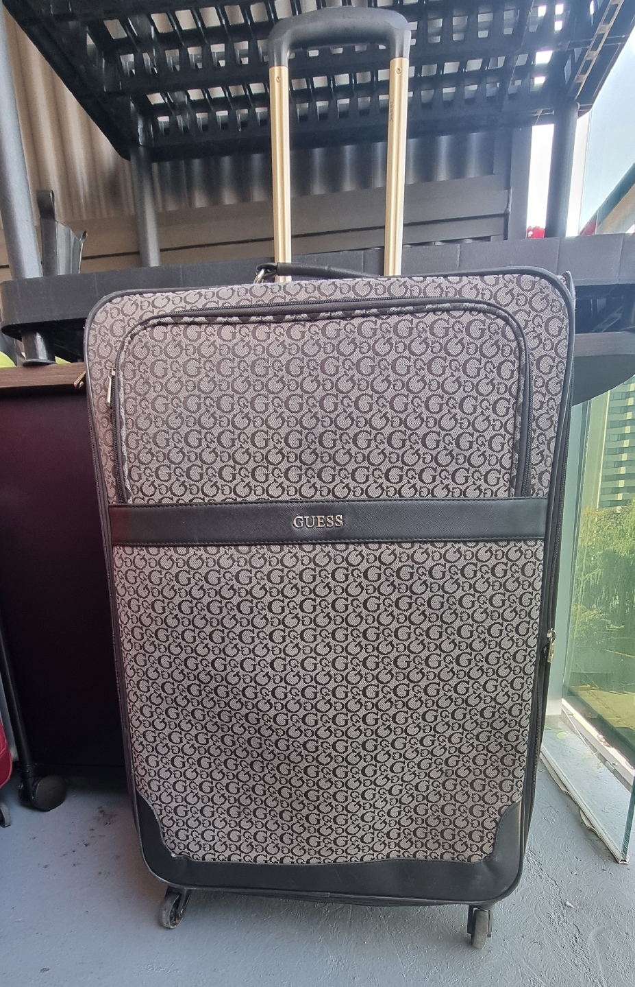 Selling a Guess rolling suitcase. It has a black and grey pattern with the Guess logo. It's in good condition.