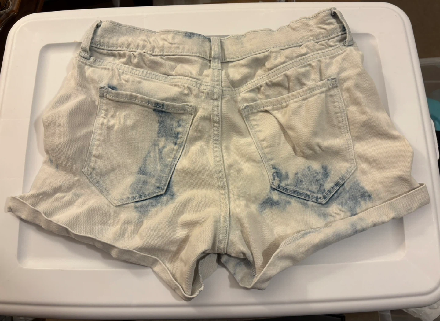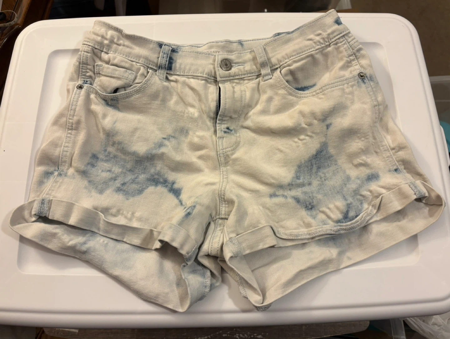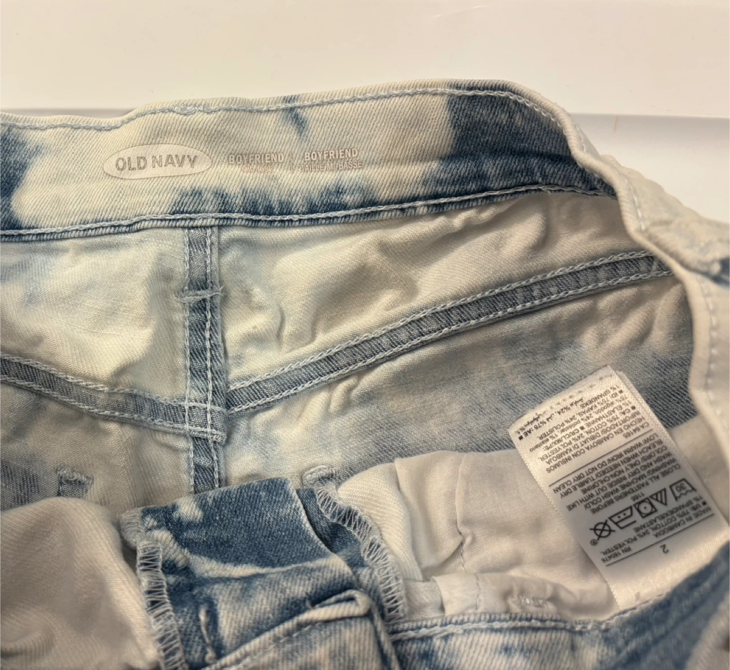 These are a pair of Old Navy Boyfriend denim shorts in a size 2. They feature a unique tie-dye wash. The material is a blend of 76% cotton, 14% rayon, 9% polyester, and 1% spandex. 😊