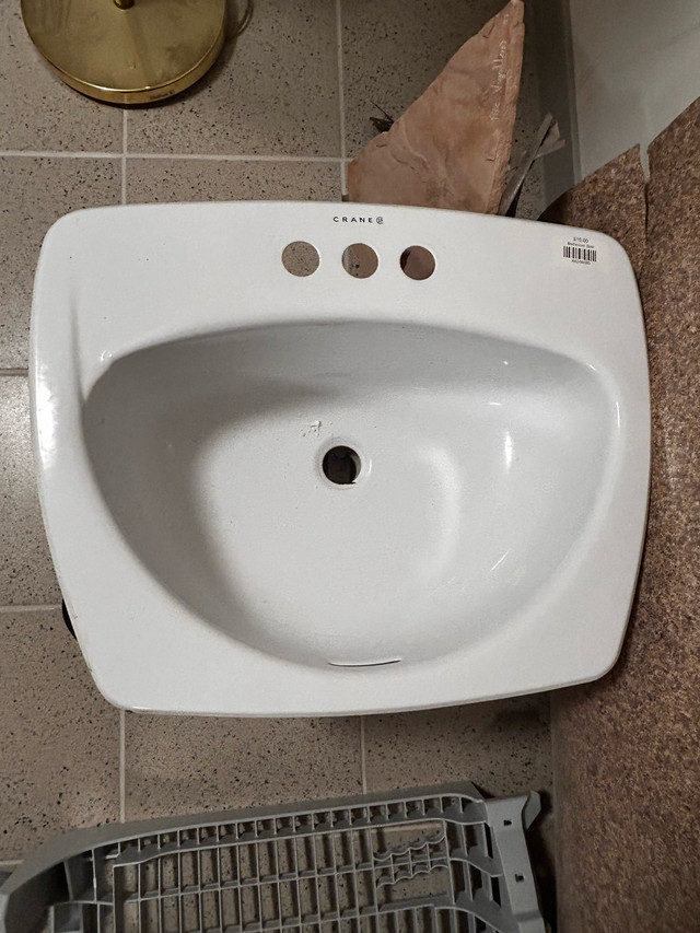 This Crane sink is a great addition to any bathroom renovation project. It has a classic design with three pre-drilled holes for faucet installation. Given its previous life, it has some signs of use, but nothing that affects its functionality. Here are some details: * Brand: Crane * Material: Porcelain * Colour: White * Faucet Holes: 3 , size 21”x17” This sink is waiting for a new home. If the ad is up, it's still available! Cash only