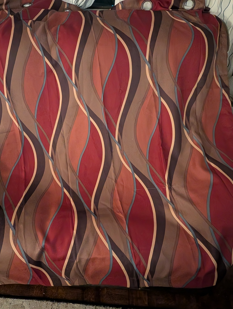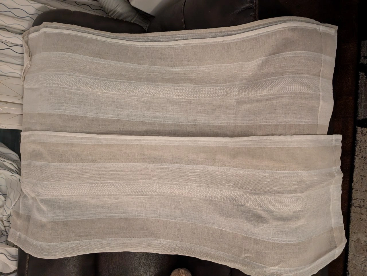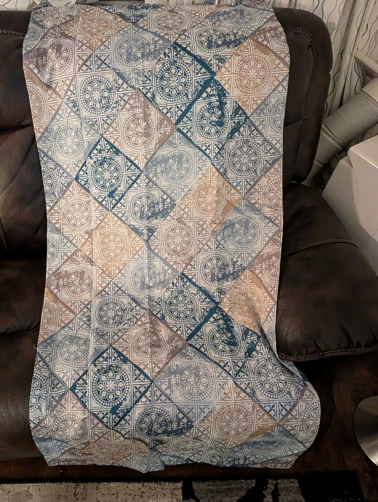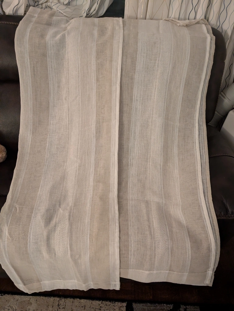 Selling a Wayfair curtain panels in the Indigo colour. The size is 54" W x 63" L. It features a unique geometric pattern that would add a nice touch to any room! Originally bought for over $40 per panel.