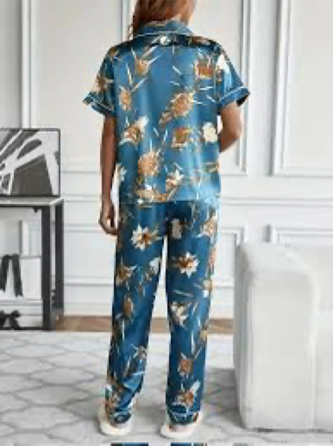 Cute floral print pajama set in a lovely blue colour! Perfect for lounging around the house or a good night's sleep. The set includes a short-sleeved button-up top and matching pants.