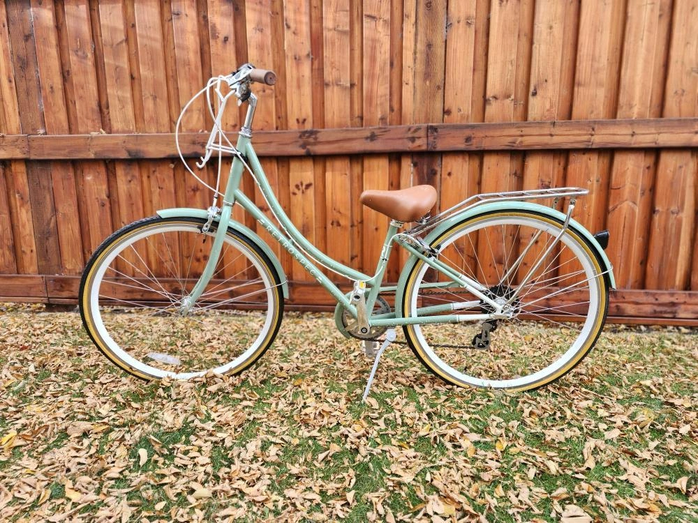 It's in great shape. The bike features a comfortable seat and a handy rack on the back for carrying your essentials, as well as a basket for the front! (Not shown in the photos displayed).