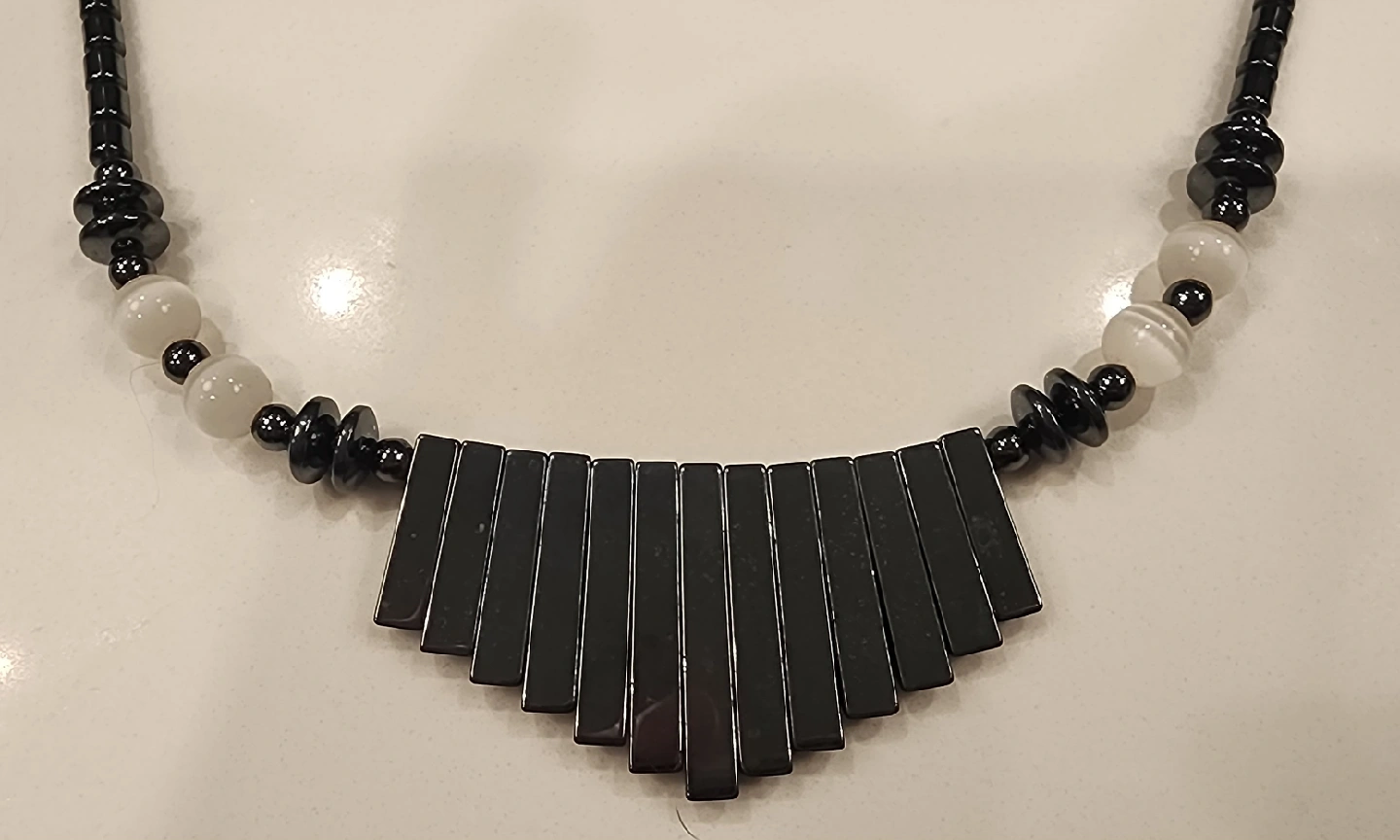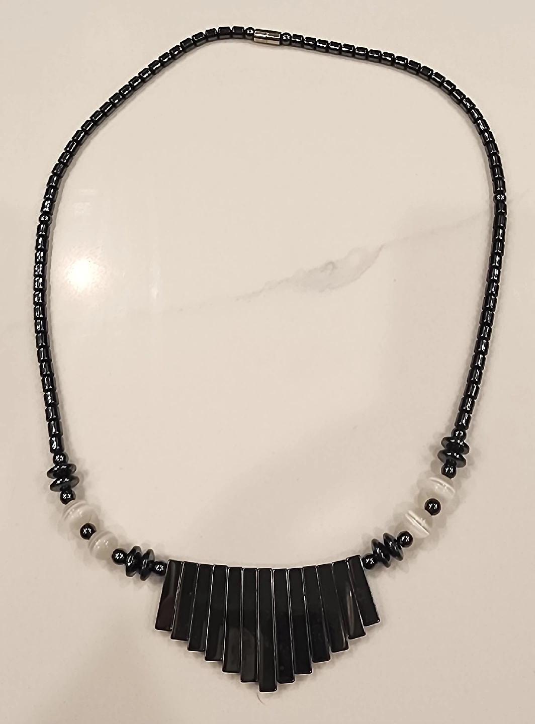 32Vintage 1980's Hematite Stone Graduated Fringe Choker Necklace measures 21 inches. Magnetic clasp.