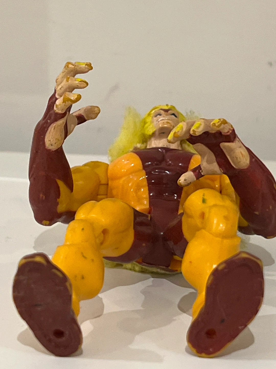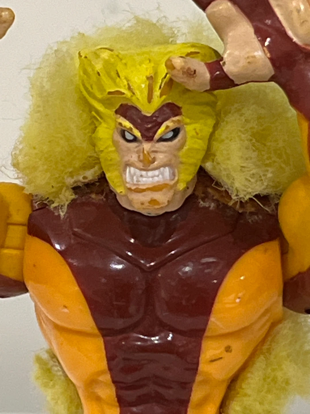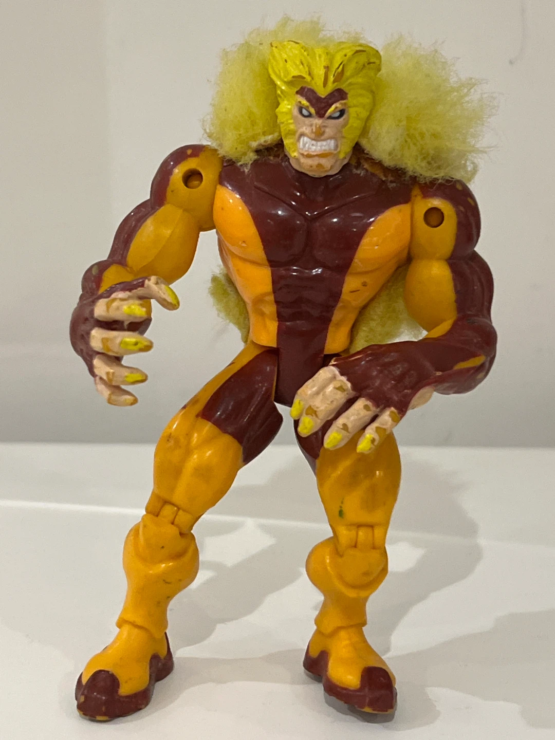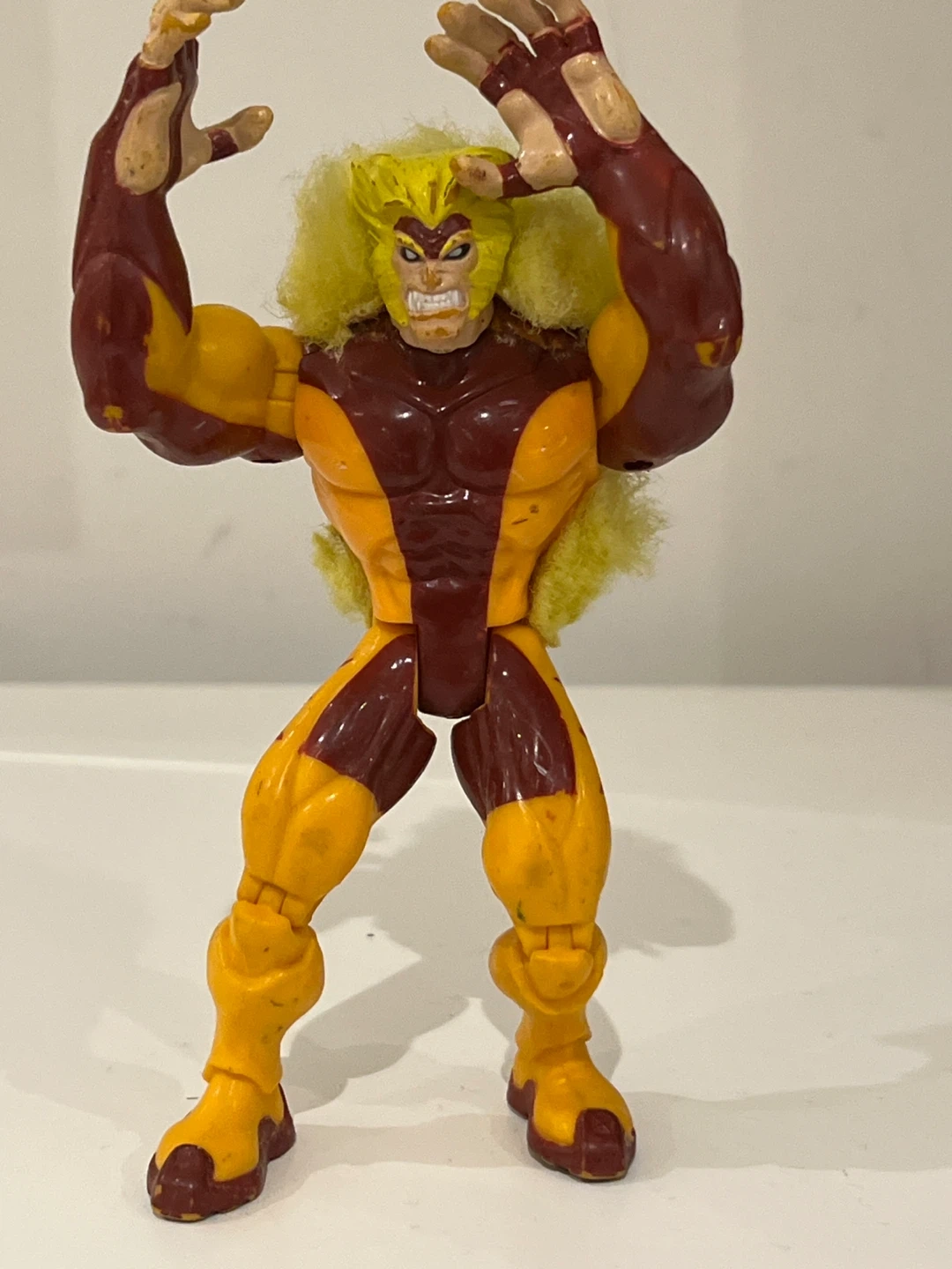 Selling a Marvel Sabertooth action figure! It's in good condition and ready for a new home. Features the classic yellow and brown design with a distinctive mane. Perfect for collectors or fans of the X-Men universe