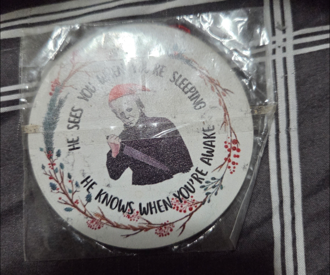Selling a Michael Myers ornament. It features an image of Michael Myers surrounded by a festive wreath and the words 'He sees you when you're sleeping, he knows when you're awake'. It's brand new and still in its original packaging